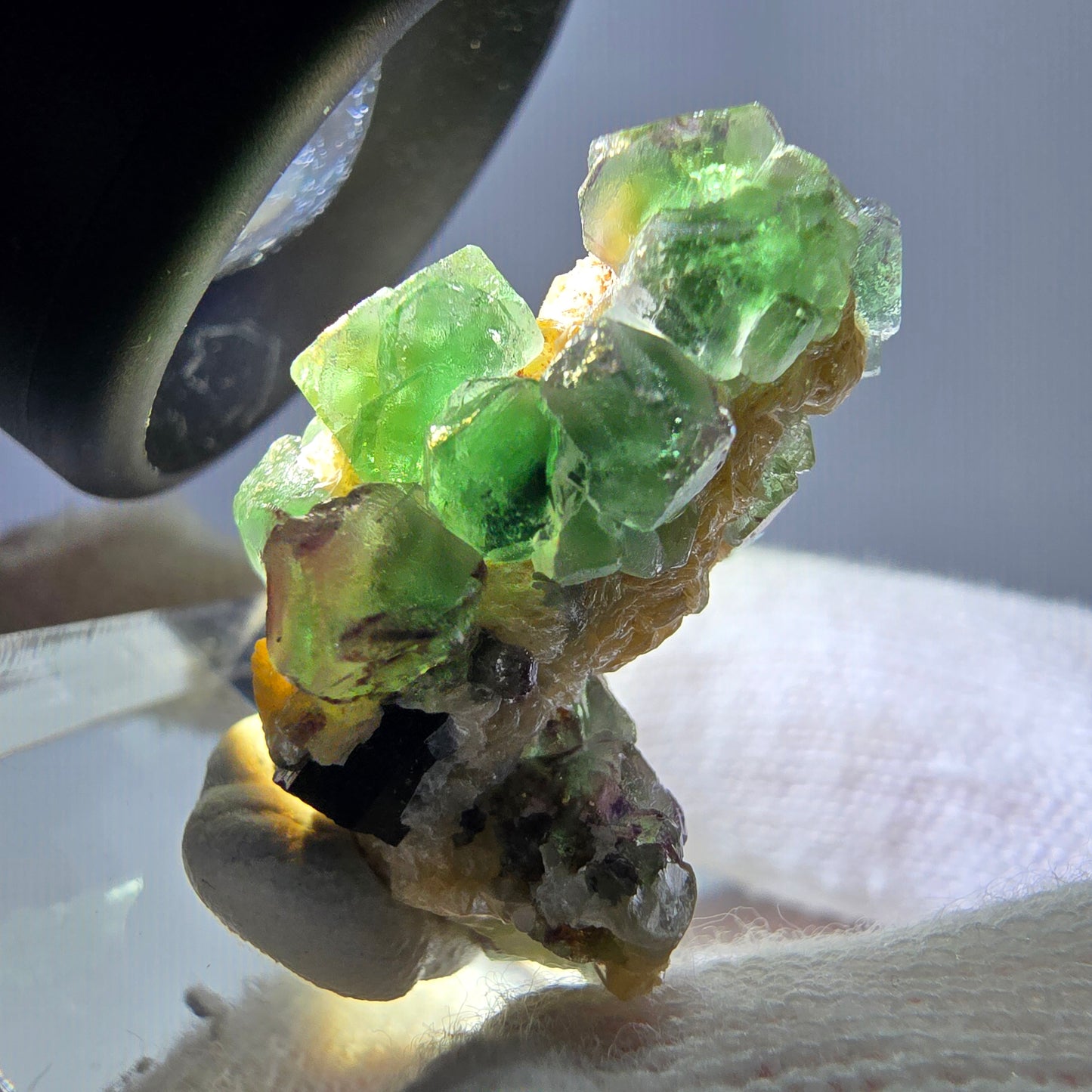 Zusätzlich finden sich auf der Stufe strahlend gelbe, metallisch glänzende Muskovit Kristalle, die einen wunderbaren Kontrast zu den klaren Fluorit Würfeln bieten. Gemeinsam bilden sie eine harmonische Einheit mit den Aussichtspunkten in Form von schwarz glänzenden Schörl Turmalin Kristallen, die ebenfalls auf dieser außergewöhnlichen Stufe gewachsen sind.