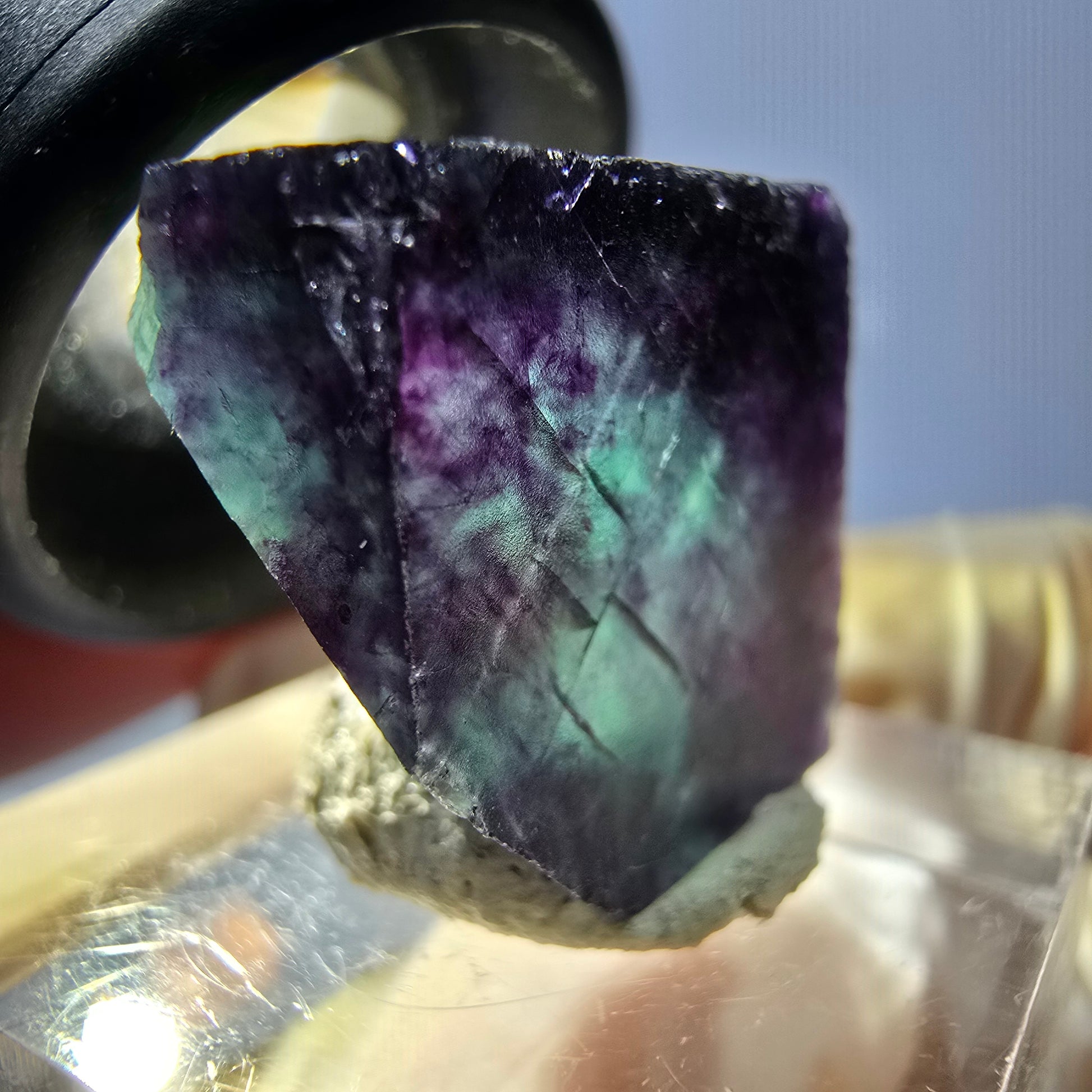 Entdecken Sie diesen wunderschönen grünen und lila Phantom Fluorit Würfel, der nicht nur durch seine beeindruckenden Farben, sondern auch durch seine einzigartige kubische Kristallform besticht. Die klare, transparente Oberfläche offenbart faszinierende Phantome im Inneren, die dieses Stück zu etwas Besonderem machen.