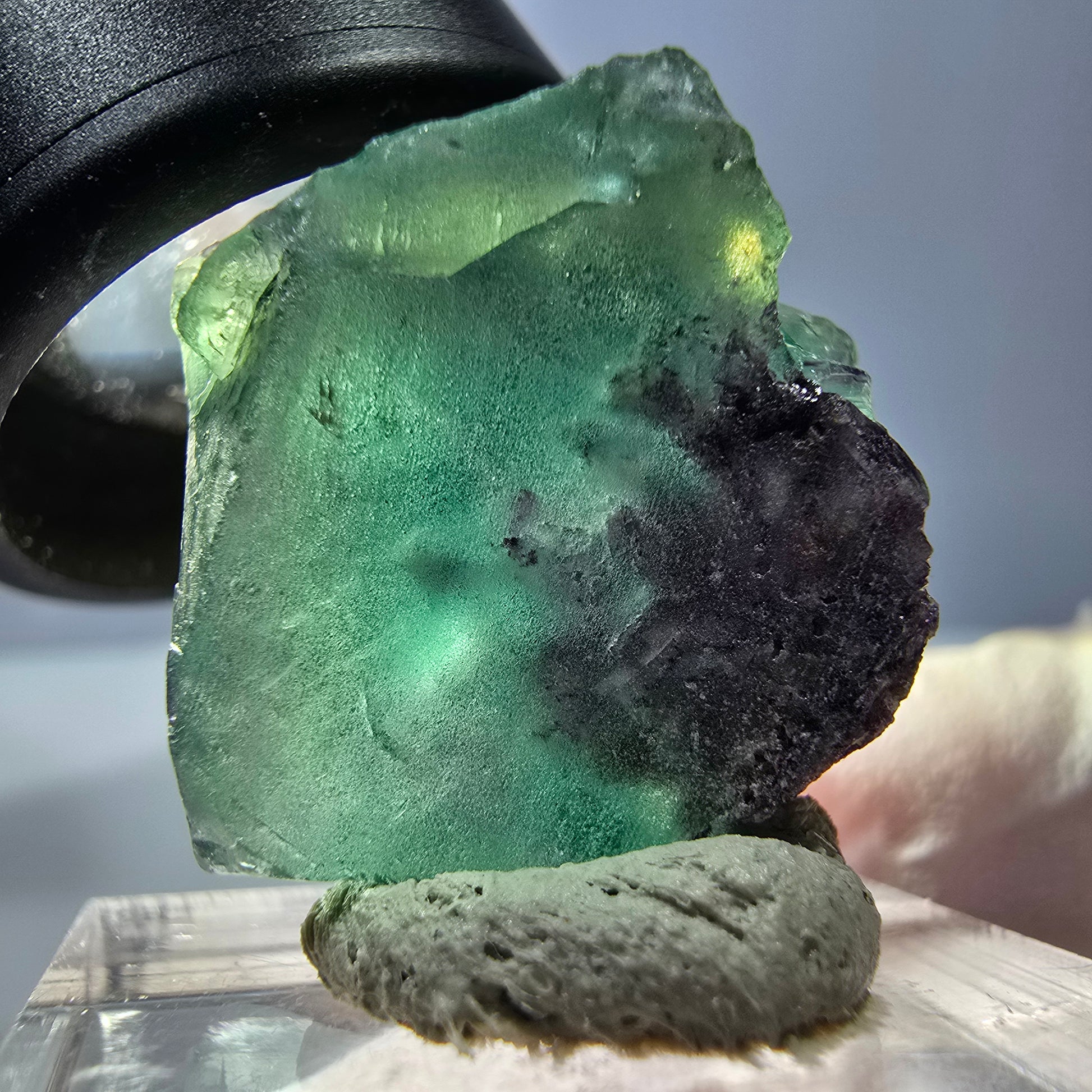 Entdecken Sie den faszinierenden Phantom Fluorit Würfel in den zauberhaften Farben grün und lila. Dieser transparente Kristall besticht durch seine kubische Form und die parkettierte Oberfläche, die perfekte Lichtreflexionen ermöglicht. Innerhalb des Würfels befinden sich beeindruckende Phantommerkmalen, die dem Kristall eine ganz besondere Note verleihen.