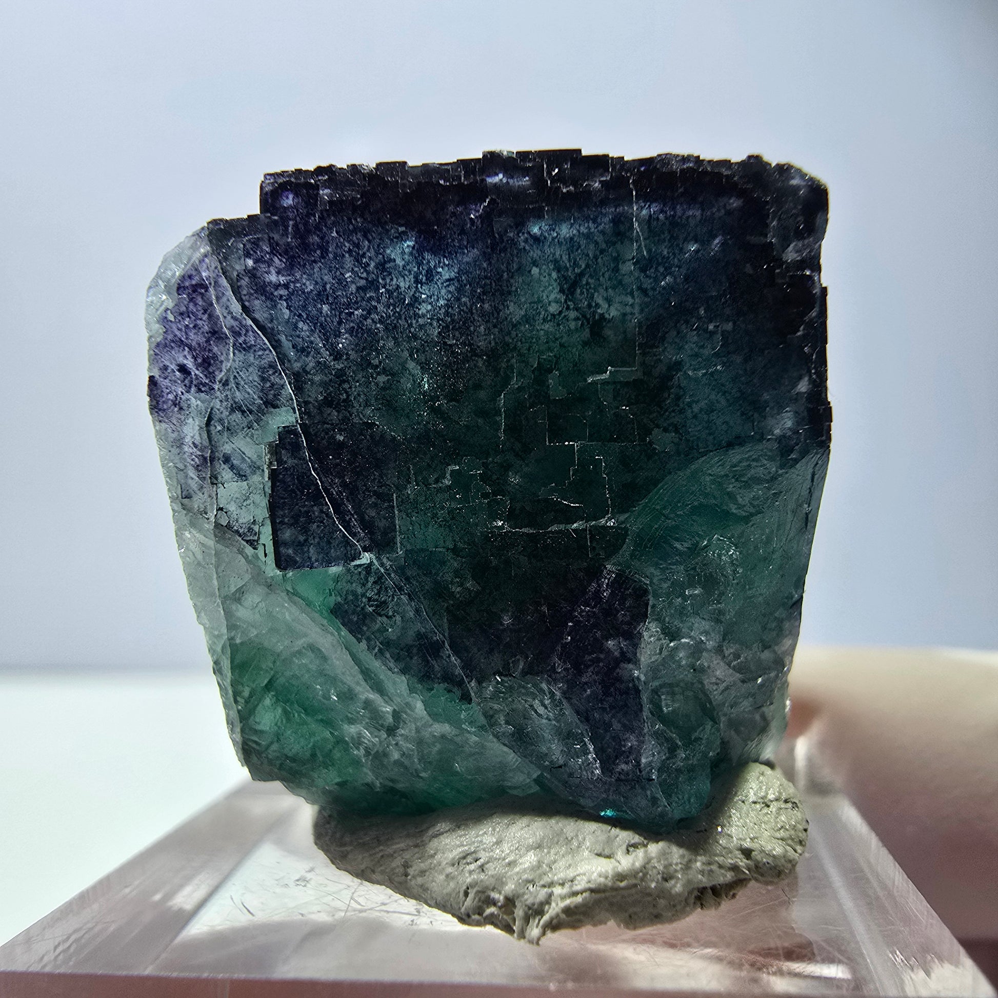 Entdecken Sie den atemberaubenden Phantom Fluorit Würfel, der mit seiner faszinierenden Farbgebung und einzigartigen Struktur verblüfft. Dieser Kristall zeichnet sich durch eine klare grün-lila Transparenz aus und bietet beeindruckende Phantome im Inneren, die ihm ein bemerkenswertes Aussehen verleihen. Die kubische Kristallform sorgt dafür, dass er in jeder Umgebung stilvoll zur Geltung kommt.