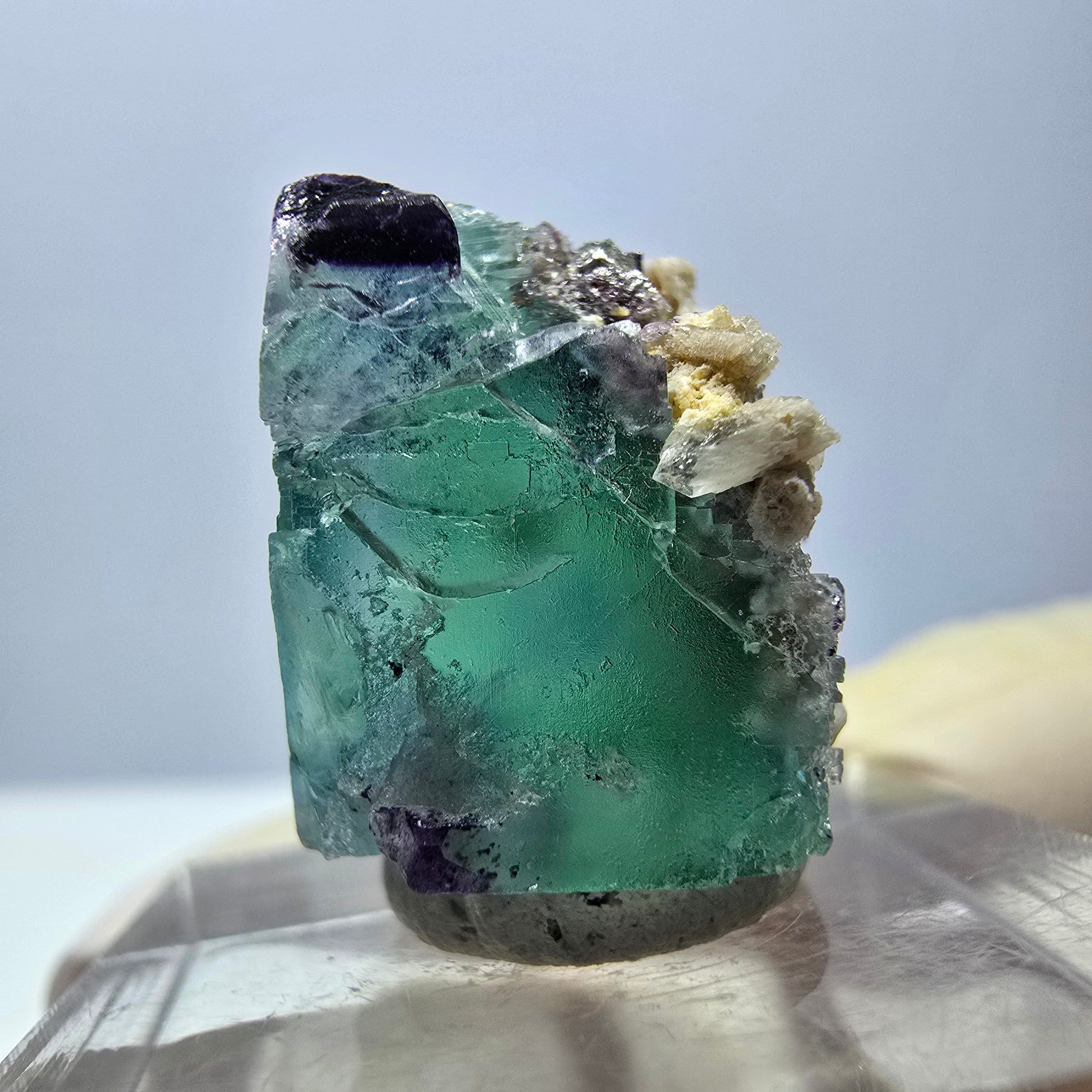 Hergestellt aus natürlichem Fluorit, stammt dieser wunderbare Kristall aus Okorusu, Namibia, einem bekannten Standort für hochwertige Mineralien. Er wurde sorgfältig bearbeitet, um seine Qualitäten bestmöglich zu präsentieren.