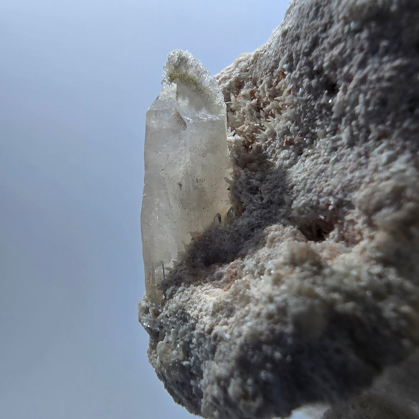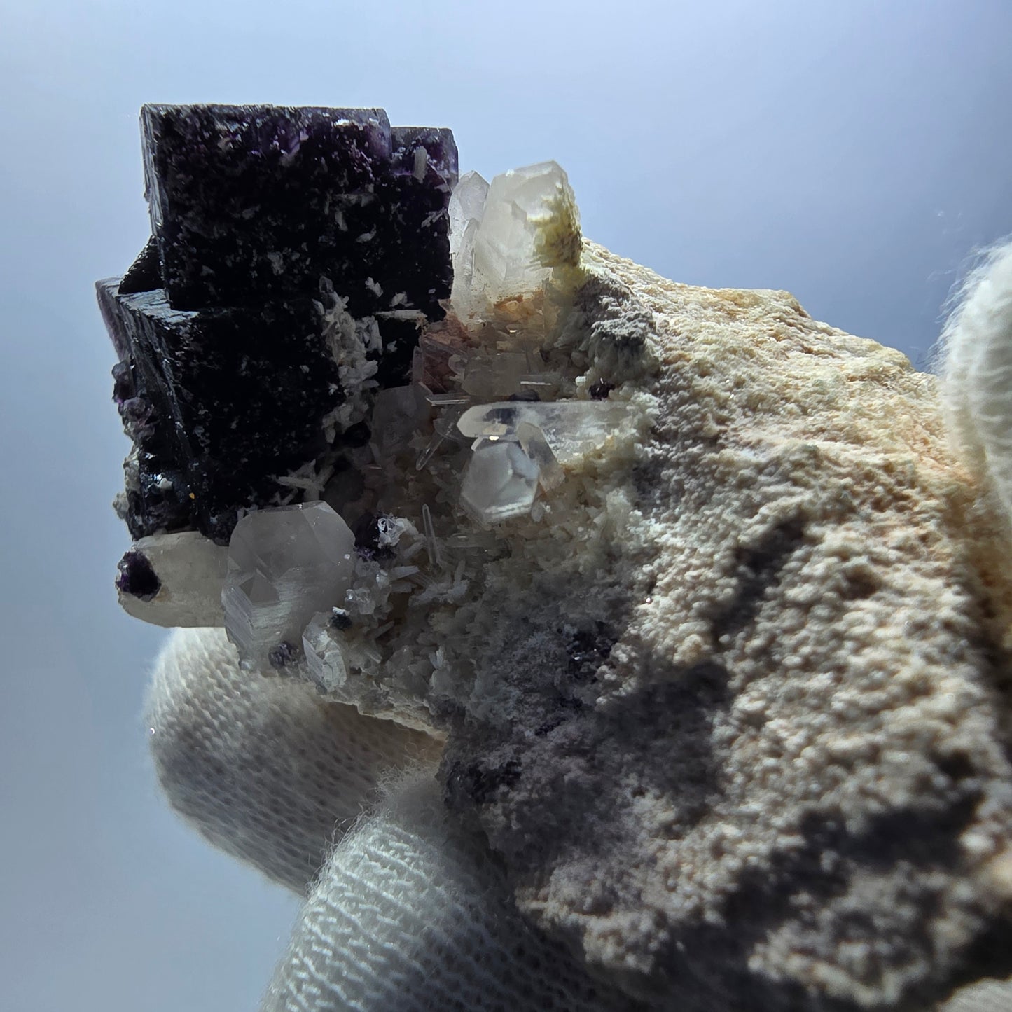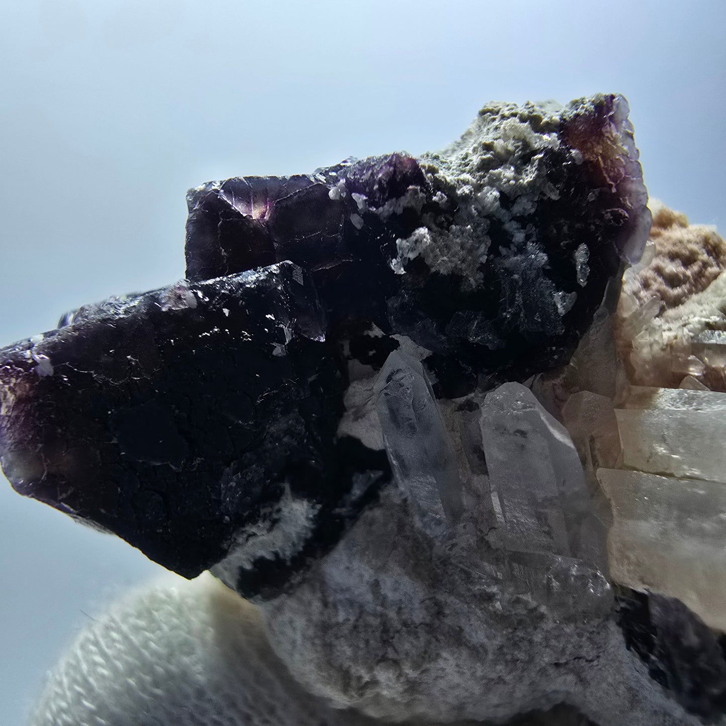 Der Untergrund der Stufe besteht aus einer schönen weiß-beigen Orthoklas-Kristallbildung, die dem Gesamteindruck zusätzlich Würze verleiht.