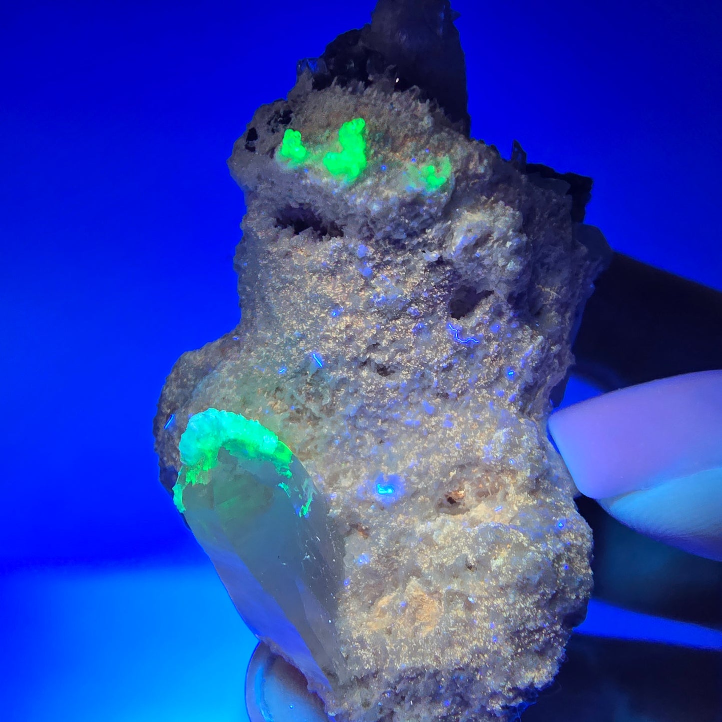 - Neongelbe Hyalit-Kristalle unter UV-Licht