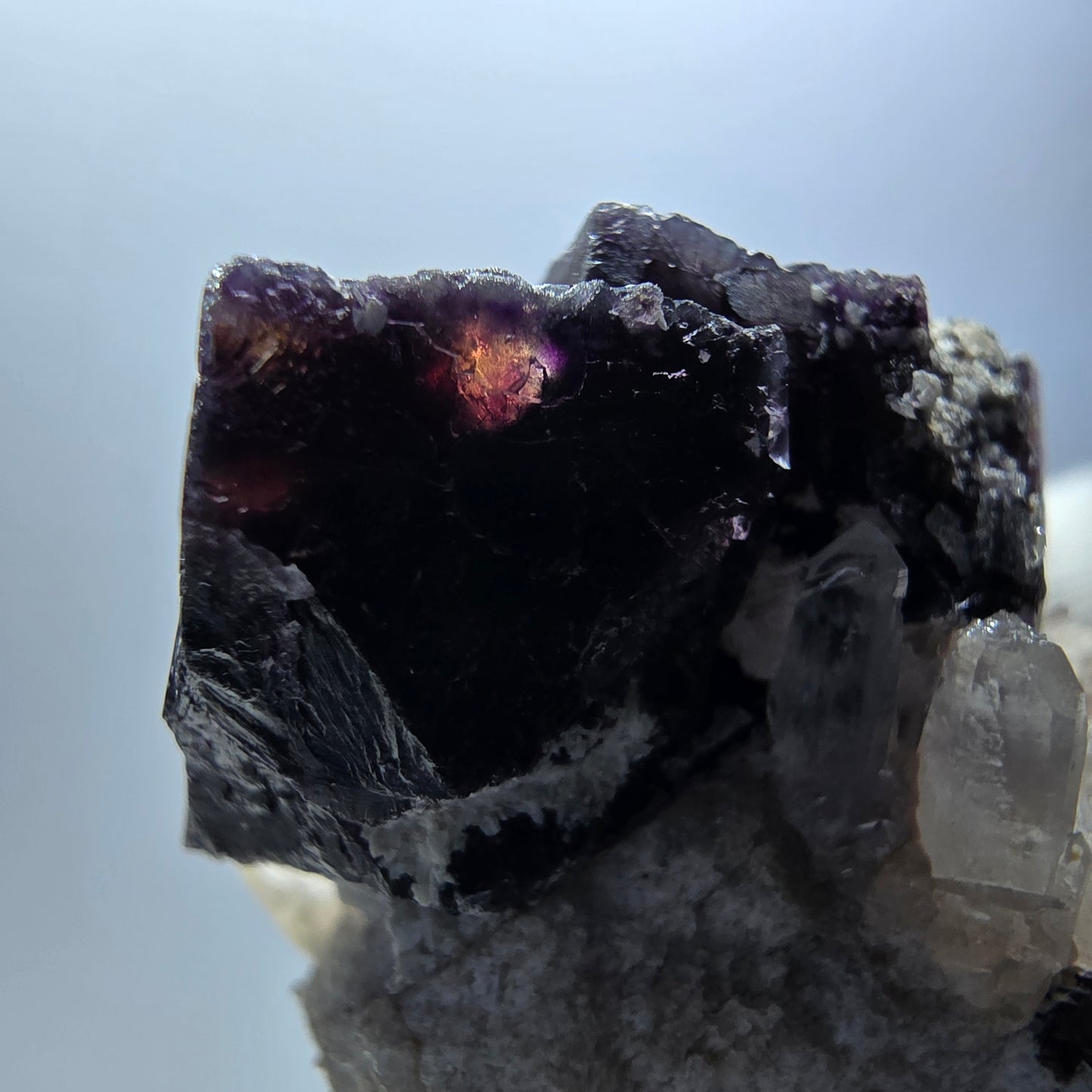 Phantom Fluorit Würfel rot lila mit Rauchquarz und Hyalit