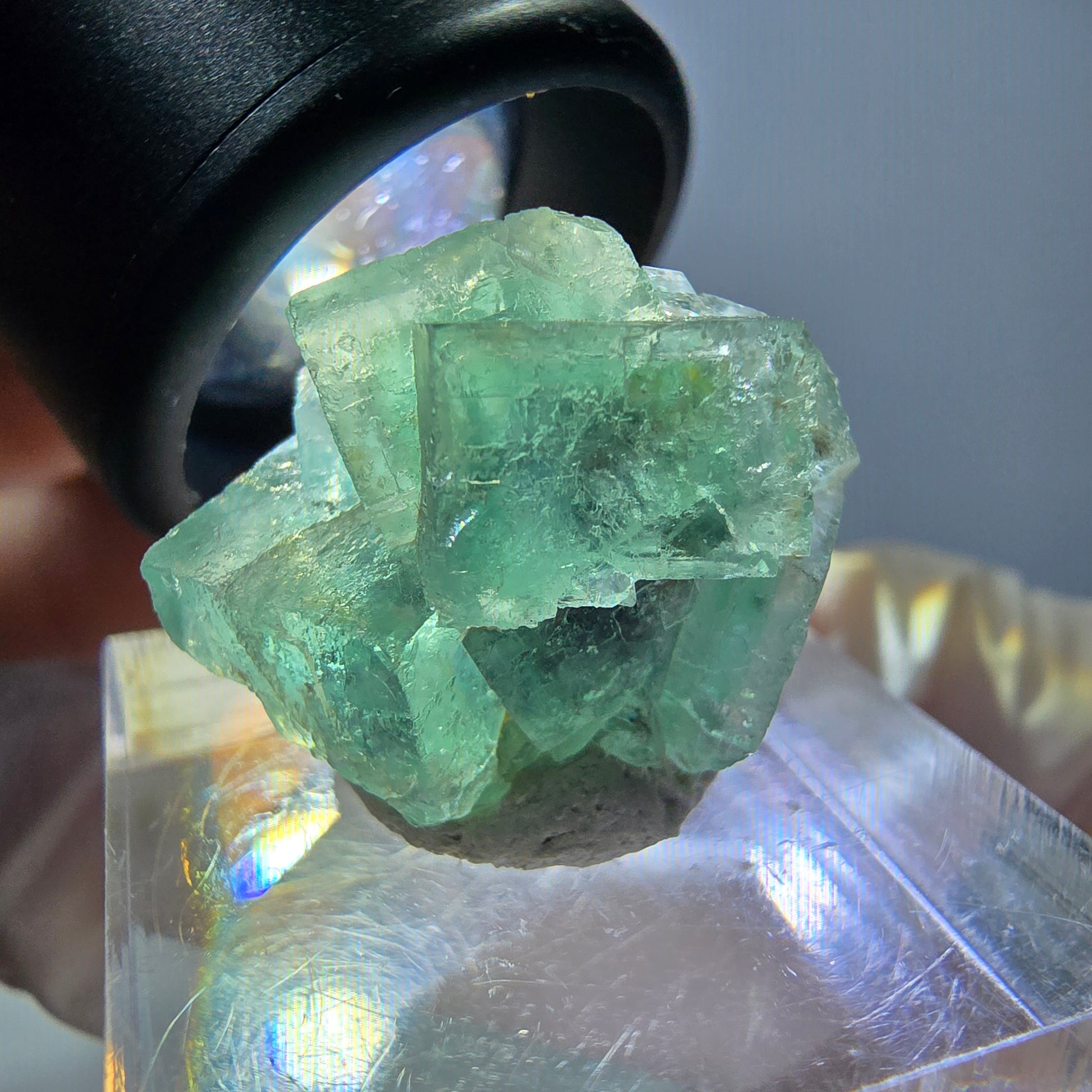 Wir präsentieren Ihnen eine außergewöhnliche und seltene Fluorit Würfel Stufe aus Okorusu, Namibia. Diese beeindruckenden kubischen Kristalle sind klar grün und transparent, wobei sie mit faszinierenden Phantomen im Inneren glänzen. Die teilweise parkettierte Oberfläche verleiht der Stufe eine einzigartige und faszinierende Textur, die das Licht auf wunderschöne Weise reflektiert.