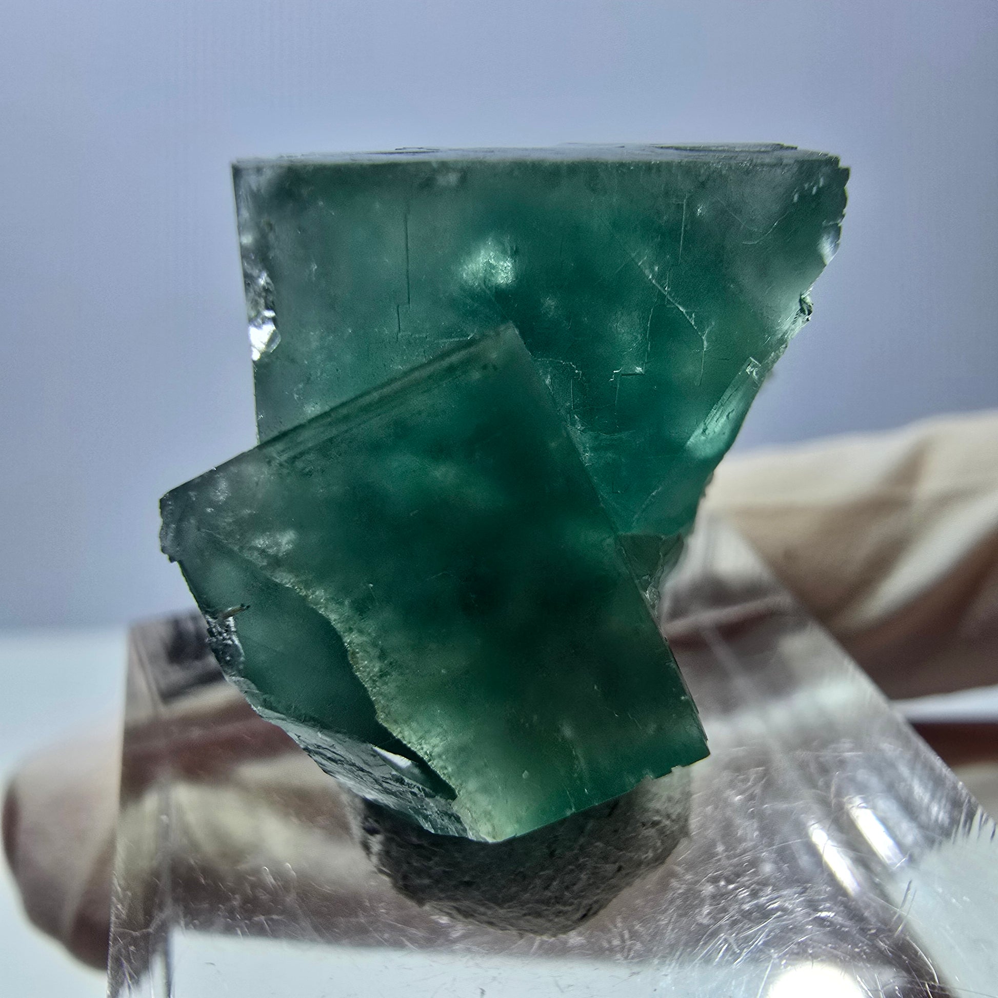 Entdecken Sie diese seltene Phantom Fluorit Würfel Stufe mit klaren, grün transparenten kubischen Kristallen, die faszinierende Phantome im Inneren beherbergen. Die teilweise parkettierte Oberfläche verleiht diesem Stück eine besondere Ästhetik und macht es zu einem Blickfang für Sammler und Liebhaber von Mineralien.