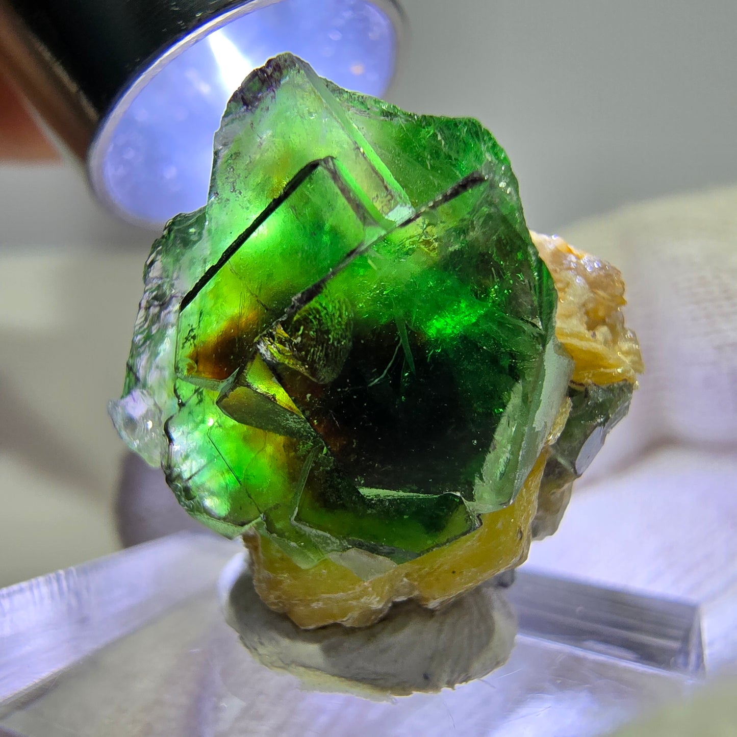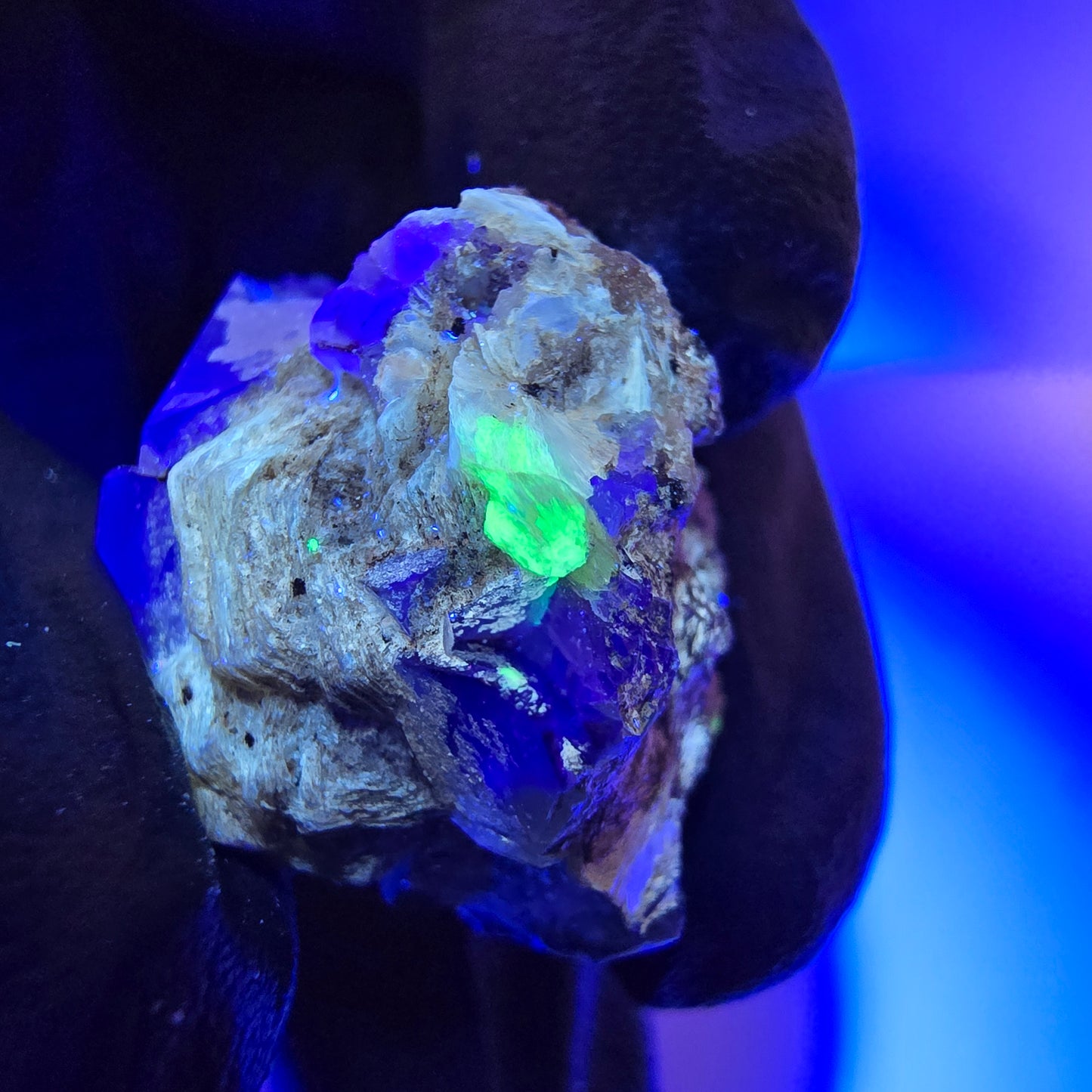 - Leuchtende Hyalit Kristalle unter UV-Licht
