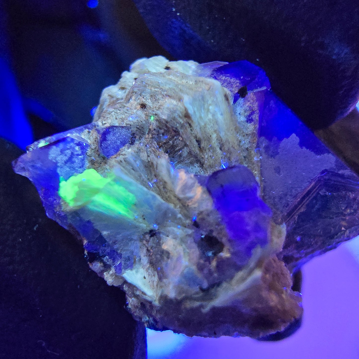 Zusätzlich finden sich auf der Stufe auch seltene, gelb metallisch glänzende Muskovit Kristalle, die einen beeindruckenden Kontrast zu den dunklen Schörl Turmalin Kristallen bieten. Diese schwarzen Kristalle fügen der Stufe eine besondere Tiefe und Dimension hinzu. Ein weiteres Highlight sind die Hyalit Kristalle, die bei UV-Licht in einem strahlenden Neon-Magenta leuchten und die Schönheit dieser Mineralienstufe abrunden.