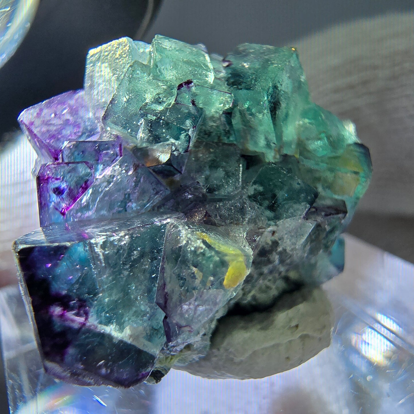 Entdecken Sie diese außergewöhnliche Mineralienstufe, die elegante Phantom Fluorit Würfel in einem spektakulären Farbspiel von grün, weiß und lila präsentiert. Diese zauberhaften, zonalen, transparenten Kristalle sind nicht nur aufgrund ihrer klaren Strukturen faszinierend, sondern offenbaren auch atemberaubende Phantome im Inneren. Begleitet werden die Fluorit Würfel von metallisch glänzenden Muskovit Kristallen in einem leuchtenden Gelb sowie schwarzem Schörl Turmalin, der der Stufe einen eindrucksvollen Kontrast verleiht.