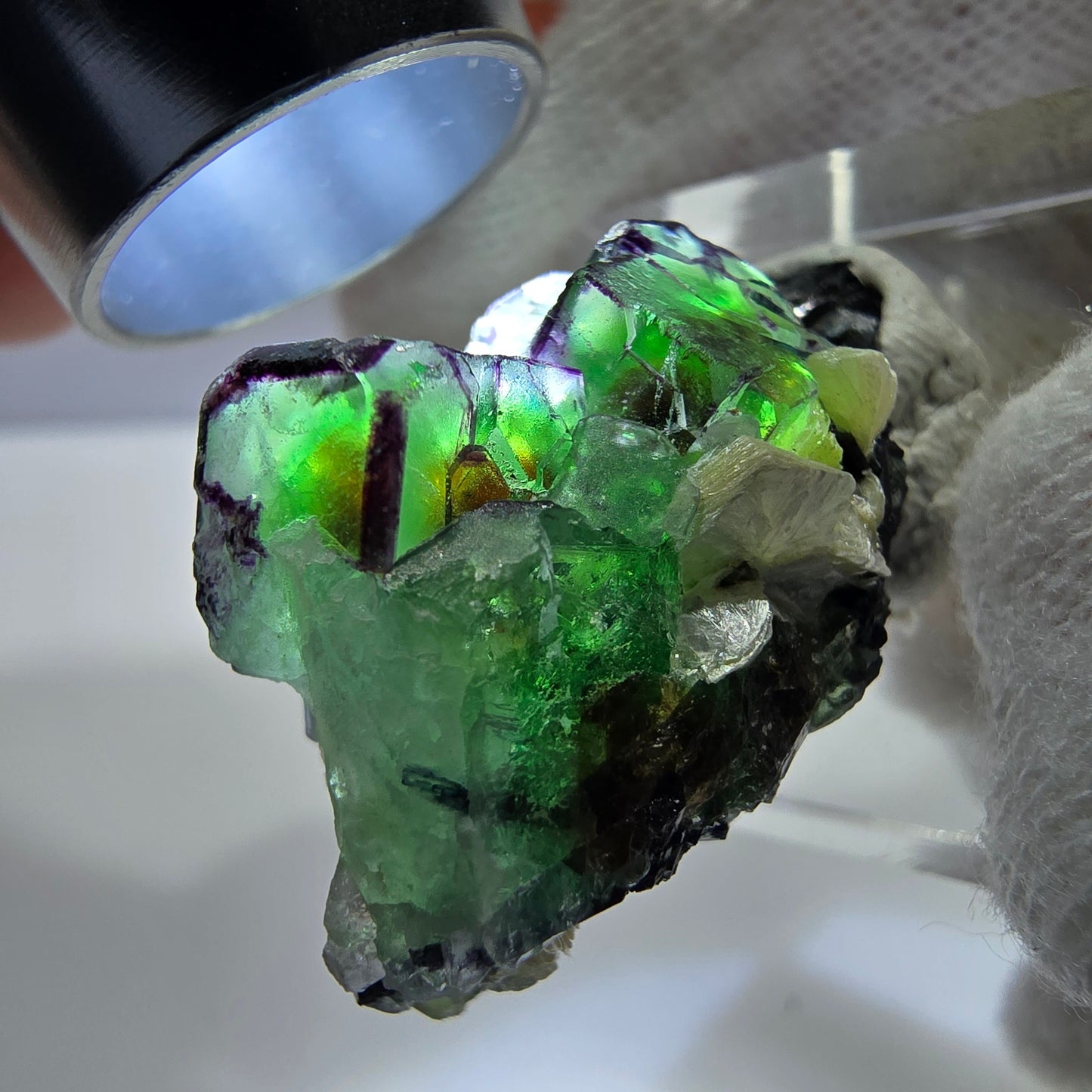 Entdecken Sie die beeindruckende Seltenheit dieser Mineralienstufe, die aus bezaubernden, grün-weiß-transparenten, lila zonalen Phantom Fluorit Würfeln besteht. In diesen Würfeln sind wunderschöne Phantome zu erkennen, die den meisten Sammlern einen faszinierenden Anblick bieten. Diese besondere Stufe wird zusätzlich von gelb metallisch glänzenden Muskovit Kristallen und schwarz glänzenden Schörl Turmalin Kristallen begleitet, was die visuelle Attraktivität und die mineralogische Komplexität dieser Sammlung erheblich steigert.