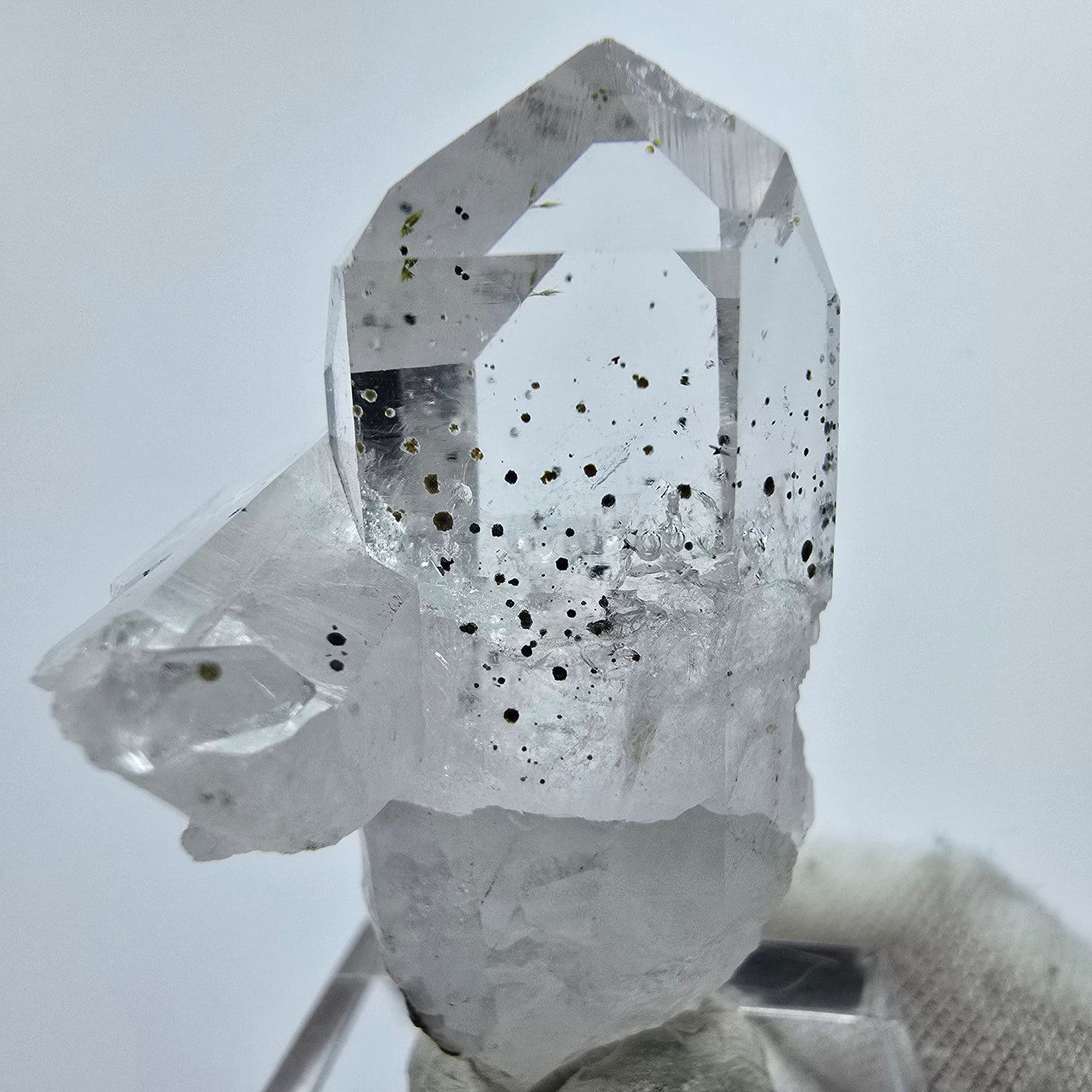 Zusätzlich sind in diesem Kristall einige schwarze Hämatit Kristalle eingewachsen, die für einen spektakulären Kontrast sorgen und dem Stück eine besondere Tiefe verleihen. Ein wahrhaft einzigartiges Naturprodukt, das sowohl Ästheten als auch Liebhaber mineralogischer Wunder begeistern wird.