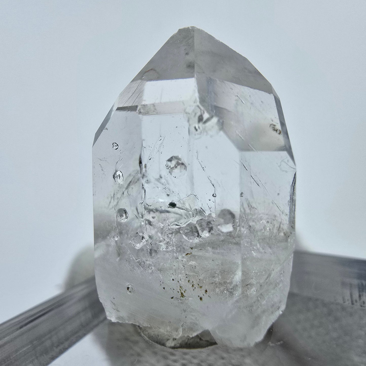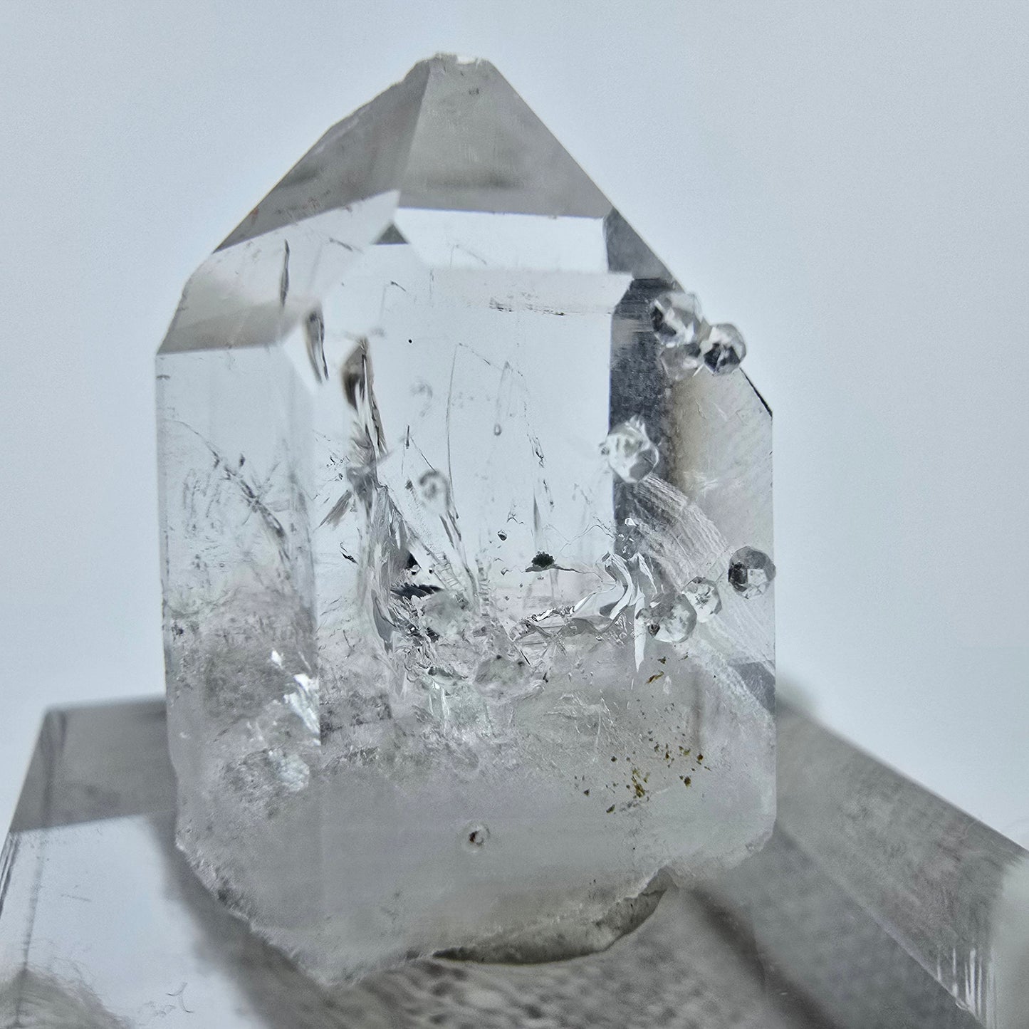 Entdecken Sie diesen seltenen und faszinierenden klaren, weiß transparenten Quarz Kristall, der beeindruckende Phantome in seinem Inneren birgt. An einer Seite des Kristalls haben sich kleine, weiß transparente Analcim Kristalle gebildet, die ihm eine besondere Note verleihen. Mit seinen Maßen von 23 x 17 x 11 mm und einem Gewicht von lediglich 6 g ist dieser Kristall nicht nur ein echter Blickfang, sondern auch ein einzigartiges Sammlerstück.