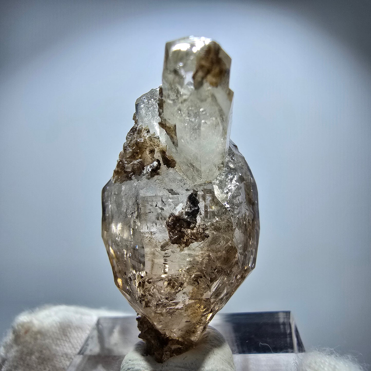Entdecken Sie die faszinierenden Eigenschaften des seltenen Phantom Rauchquarz DT Skelett Zepter Kristalls. Diese außergewöhnlichen Kristallspitzen zeichnen sich durch ihre klare und rauchige Farbgebung aus, ergänzt von braun-weiß-transparenten Kristallbildungen und faszinierenden Phantomen im Inneren. Die besondere Doppelender-Zepter-Kristallform und die Fenster-förmigen Einschlüsse verleihen diesen unikatartigen Stücken einen besonderen Charme.