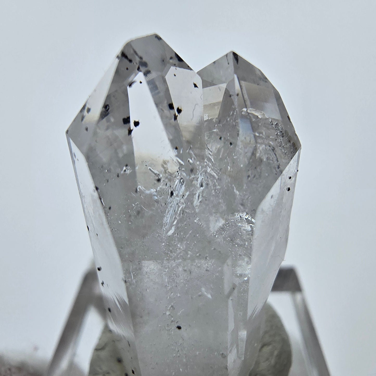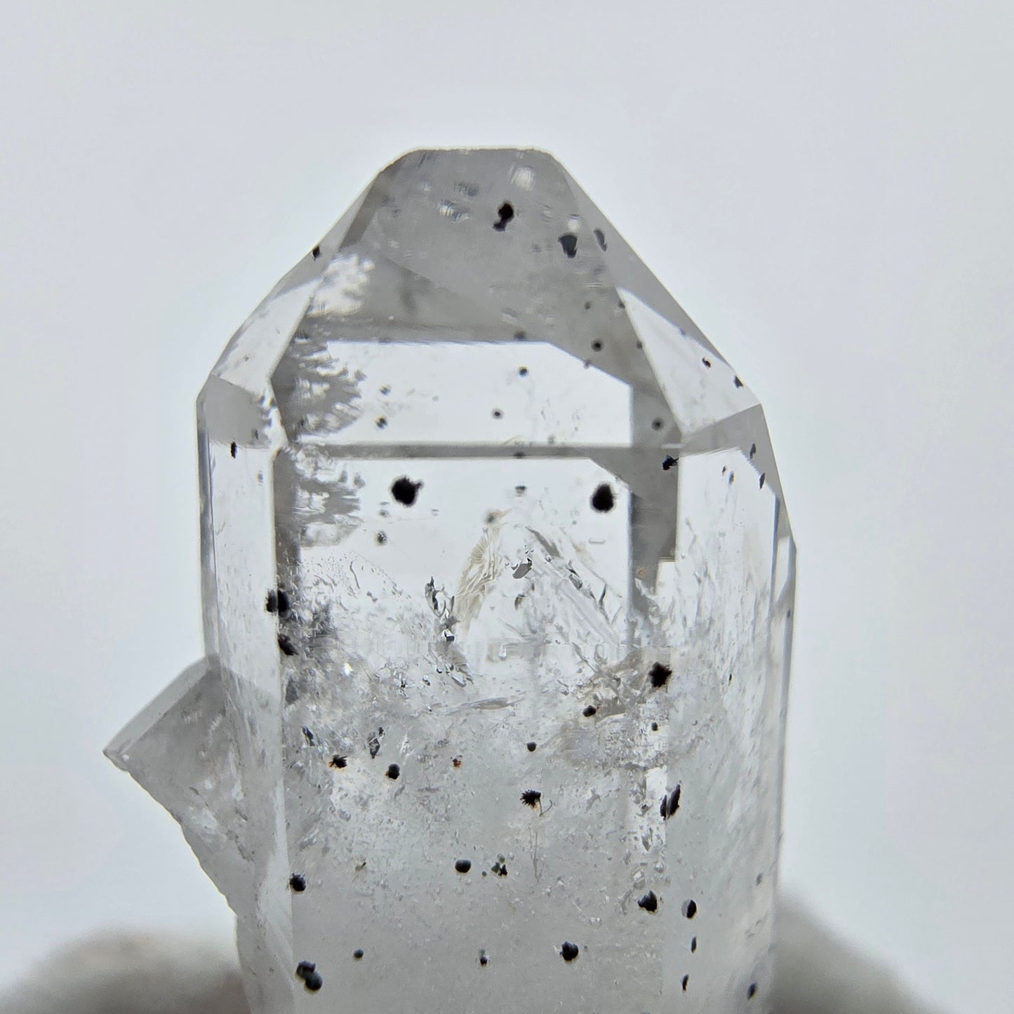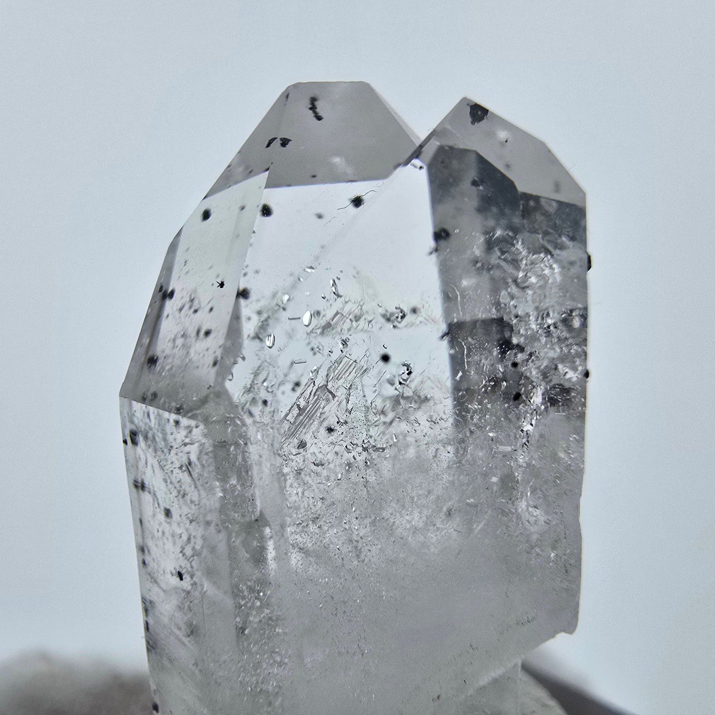 Entdecken Sie diesen außergewöhnlichen Phantom Rauchquarz, der durch seine klare, weiß-braune Transparenz besticht. Die Kristallspitze zeigt beeindruckende Phantome im Inneren, die diesem Stück eine mystische Ausstrahlung verleihen. Besonders bemerkenswert sind die seltenen schwarzen Hämatit Kristalle, die im Inneren sichtbar sind und dem Kristall eine zusätzliche Dimension verleihen.