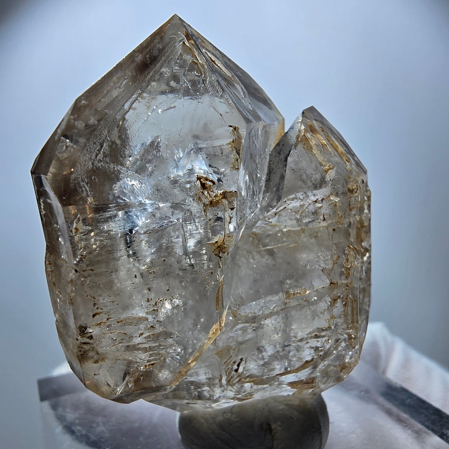 Entdecken Sie diesen faszinierenden Phantom Rauchquarz Skelett DT Zepter Kristall aus Namibia. Diese seltene und klare Rauchquarz-Kristallspitzen sind geprägt von einer prachtvollen braun-weißen transparenten Kristallbildung, die mit wunderschönen Phantomen im Inneren verzaubert. Die besondere Doppelender-Zepter-Kristallform (DT Zepter Quarz) in Kombination mit einer einzigartigen skelettartigen Oberfläche (Skelettquarz) macht diesen Kristall zu einem herausragenden Exemplar.