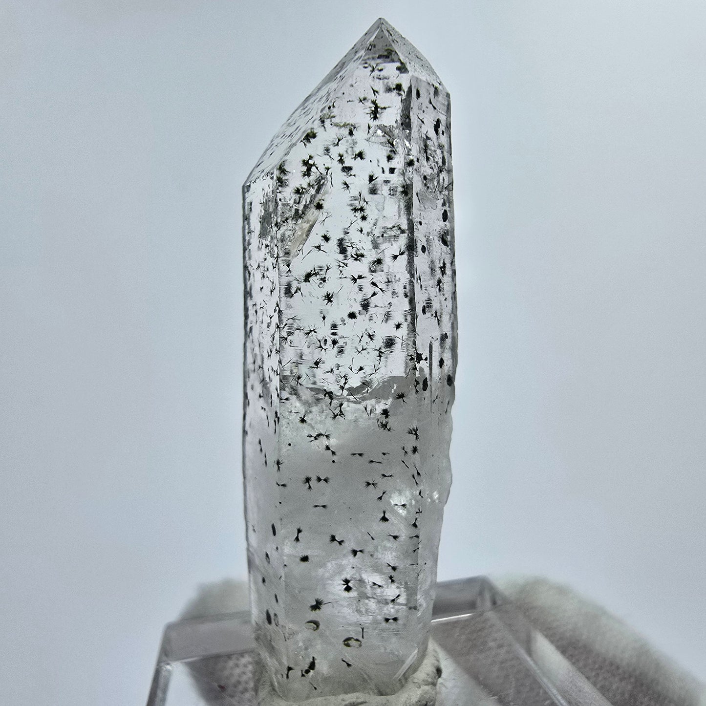 Entdecken Sie diesen atemberaubenden Quarz Kristall mit Hämatit und Epidot, der durch seine sehr klare, weiß-transparente Spitze besticht. Der Kristall beeindruckt mit feinen mineralischen Einslüssen, die ihm eine besondere Eleganz verleihen. Auf und in dem Kristall sind schwarze Hämatit-Kristalle sowie grüne Epidot-Kristalle gewachsen, die einen faszinierenden Kontrast zur klaren Struktur des Quarzes bieten.