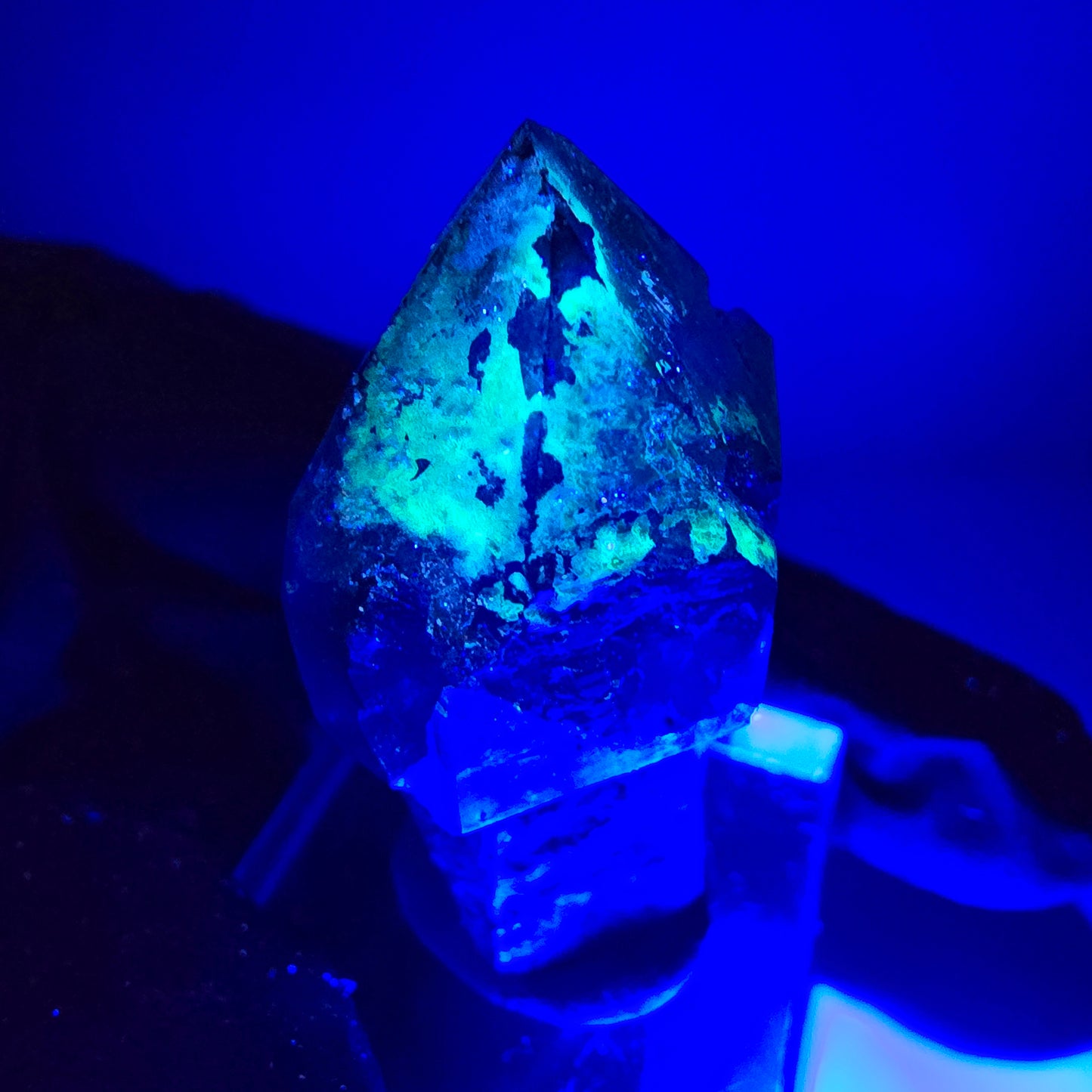 Entdecken Sie die faszinierende Schönheit unserer schönen grau-transparenten Zepterform Rauchquarz Kristallspitze. Dieses einzigartige Stück besticht durch seine beeindruckenden Phantome im Inneren, die dem Kristall eine mystische Ausstrahlung verleihen. An einigen Stellen sind zudem Hyalit Kristalle zu finden, die unter UV-Licht in einem leuchtenden Neongelb erstrahlen und dem Kristall eine zusätzliche Dimension verleihen.