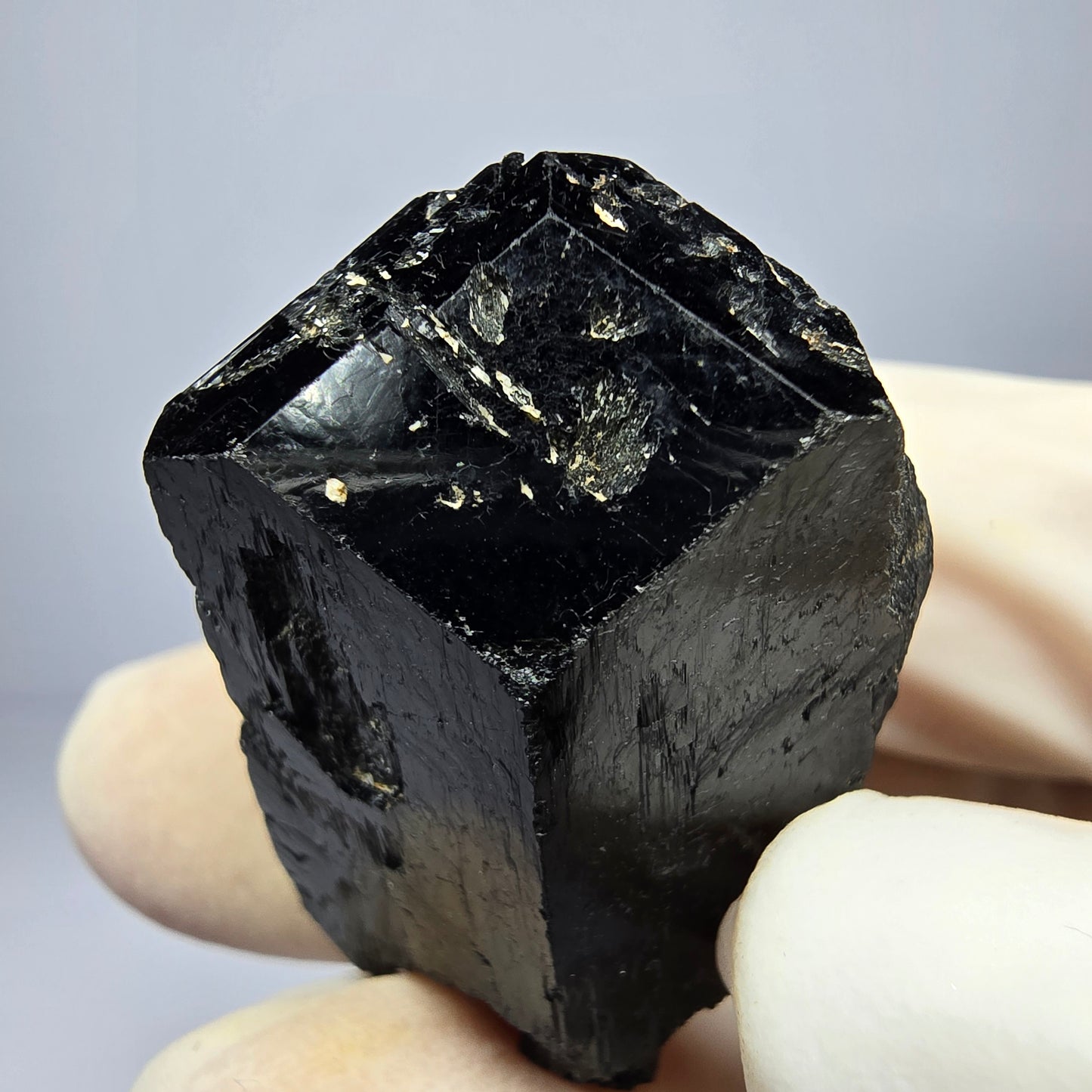 Entdecken Sie die faszinierende Schönheit des Schörl Turmalin Kristalls aus der Erongo-Region in Namibia. Dieser beeindruckende Kristall besticht durch seine symmetrische Form und das tiefschwarze, glänzende Finish, das ihm eine spiegelnde Oberfläche verleiht. Mit den Maßen von 33 mm x 24 mm x 19 mm und einem Gewicht von 20 g ist dieser Kristall nicht nur ein wunderschönes Sammlerstück, sondern auch ein echter Blickfang für jede Mineralienausstellung.