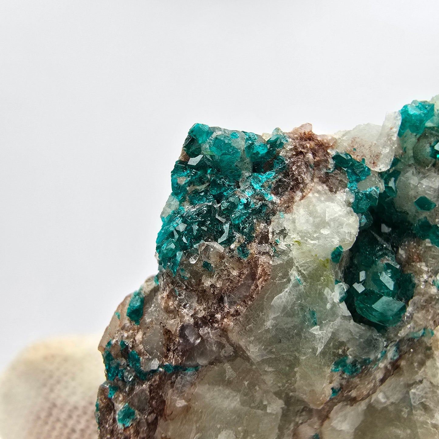 Entdecken Sie dieses außergewöhnliche Sammlerstück: eine seltene Mineralienstufe mit dunkeltürkis glänzenden und teilweise transparenten Dioptas Kristallen, die kantig gewachsen sind. Diese beeindruckenden Kristalle sind auf einer Matrix aus weißen Quarz-Kristallenarrangiert und bilden ein harmonisches Zusammenspiel von Farben und Strukturen.