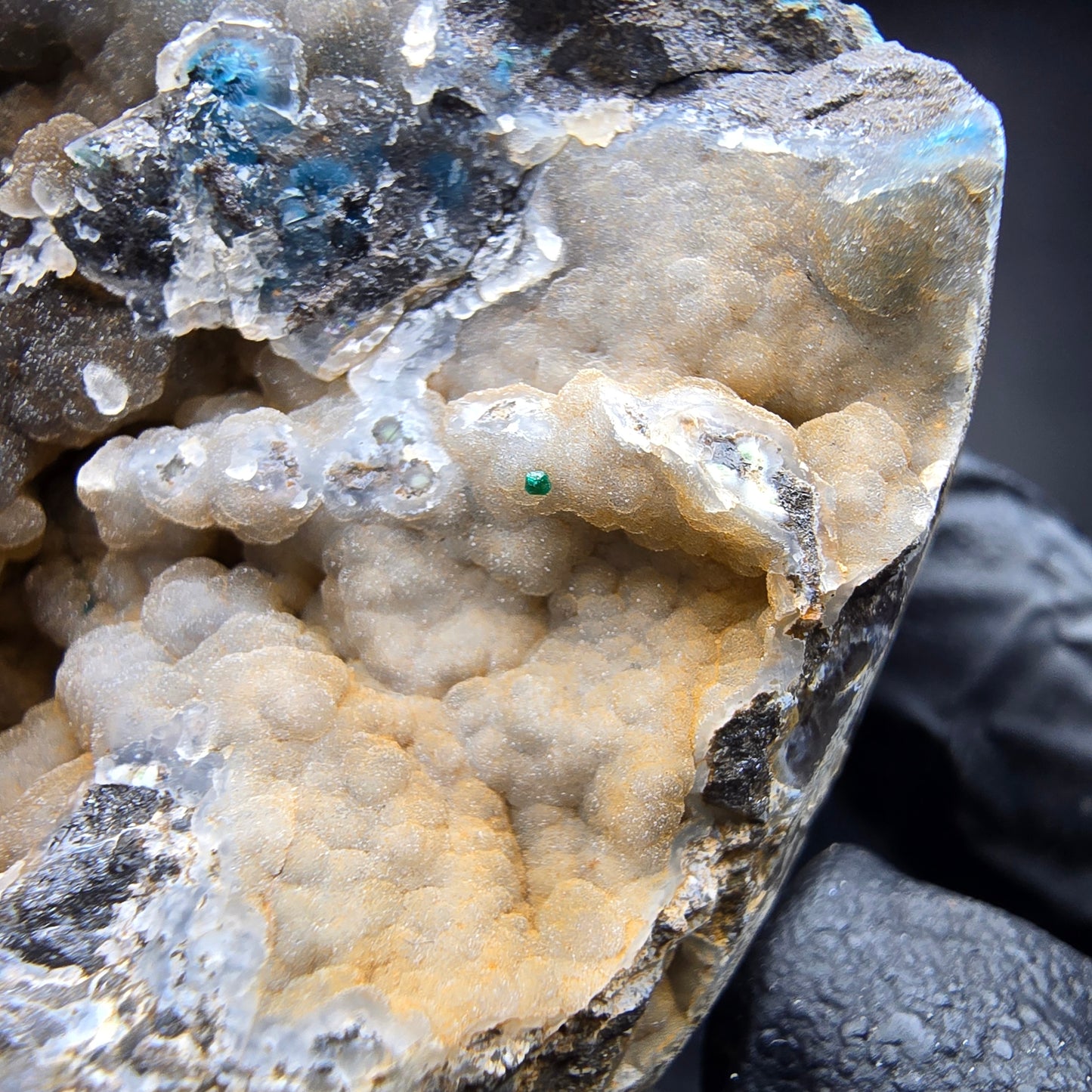 Entdecken Sie diese außergewöhnliche Mineralienstufe, die mit ihren beeindruckenden blauen, kugelförmigen Shattuckit-Kristallen und den hellgrünen, türkisen kleinen Dioptas-Kristallen besticht. Diese seltene Kombination macht die Stufe zu einem wahren Sammlerstück und einem Highlight für jeden Mineralienliebhaber.