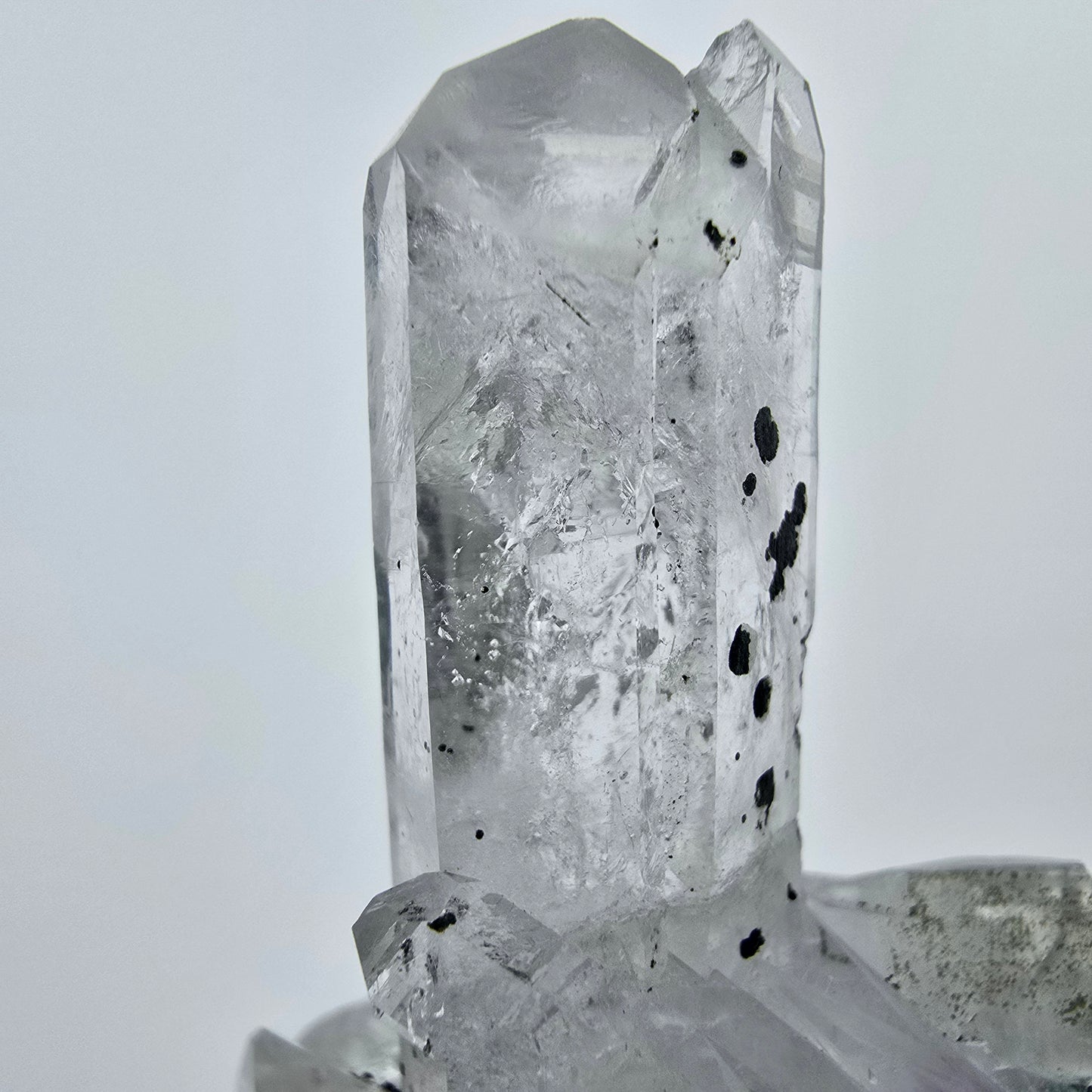 Entdecken Sie eine wunderschöne und einzigartige Mineralienstufe mit klaren, weiß-lila transparenten Phantom Amethyst-Kristallspitzen. Diese exquisite Stufe besticht durch ihre faszinierenden lila und braunen Phantommuster im Inneren der Kristalle. In einigen dieser Kristalle sind zudem markante schwarze Hämatit-Einschlüsse zu finden, die dem Gesamtbild eine besondere Note verleihen.