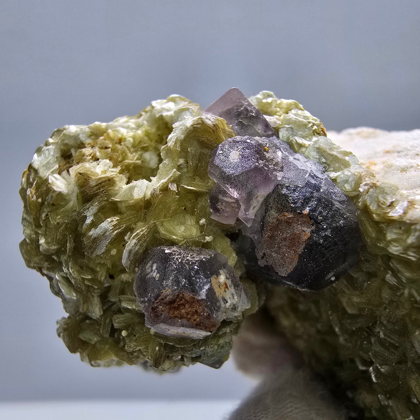 - Besonderheiten: Muskovit in gelb-grün, Hyalit leuchtet neongelb unter UV-Licht, grau-lila Fluorit Würfel