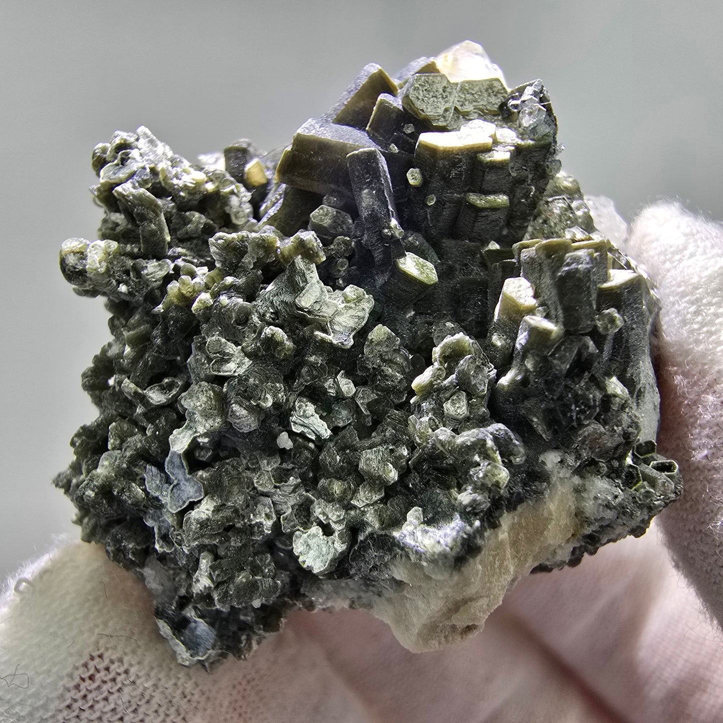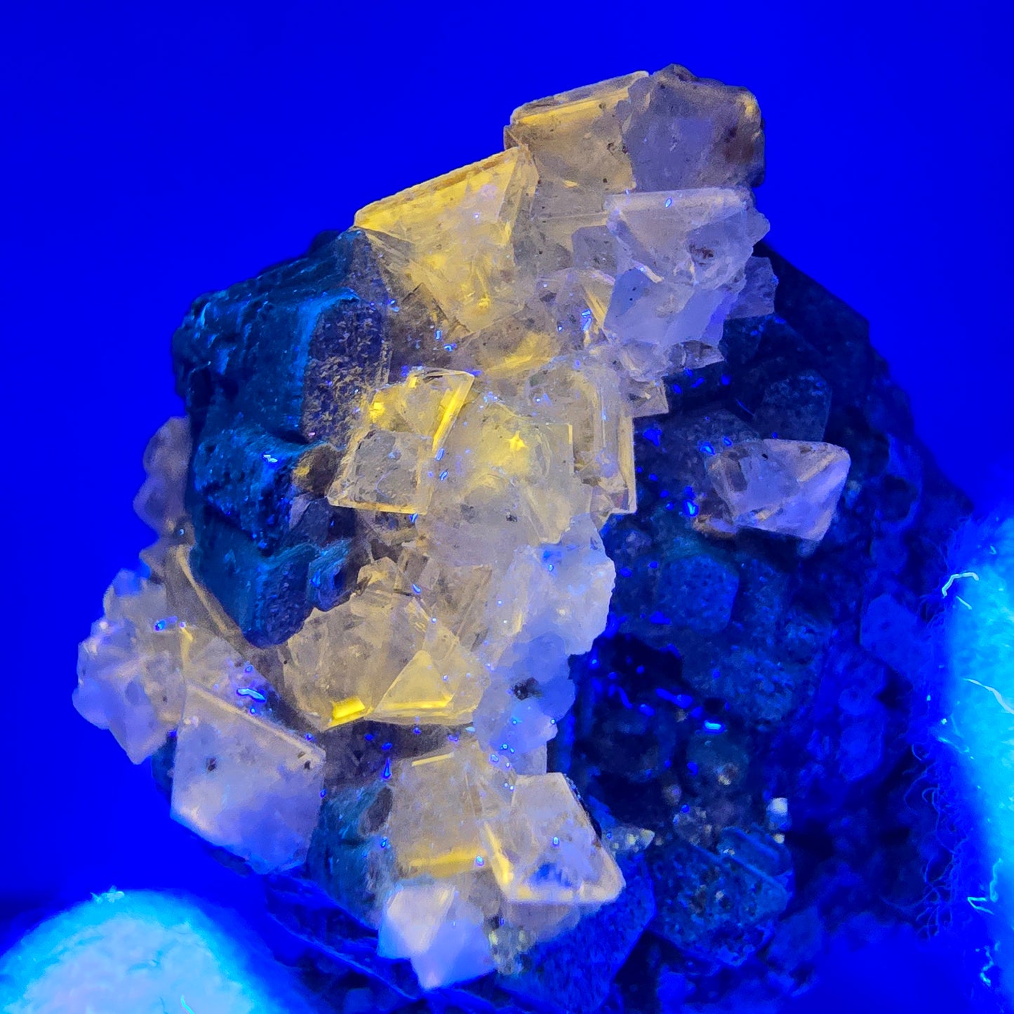 Entdecken Sie dieses außergewöhnliche Stück, das präsentiert nicht nur die Schönheit von Muskovit, sondern auch die faszinierenden Eigenschaften von Calcit. Diese seltene Mineralienstufe zeigt lange, schwarz metallisch glänzende Muskovit Kristalle in perfekter Kombination mit strahlend weißen, transparenten Calcit Kristallen. Ein besonderes Highlight ist die UV-Reaktivität des Calcit: Unter UV-Licht leuchten die Kristalle in einem auffälligen Gelbton und verleihen diesem Schmuckstück eine wunderschöne, mystische Aura.
