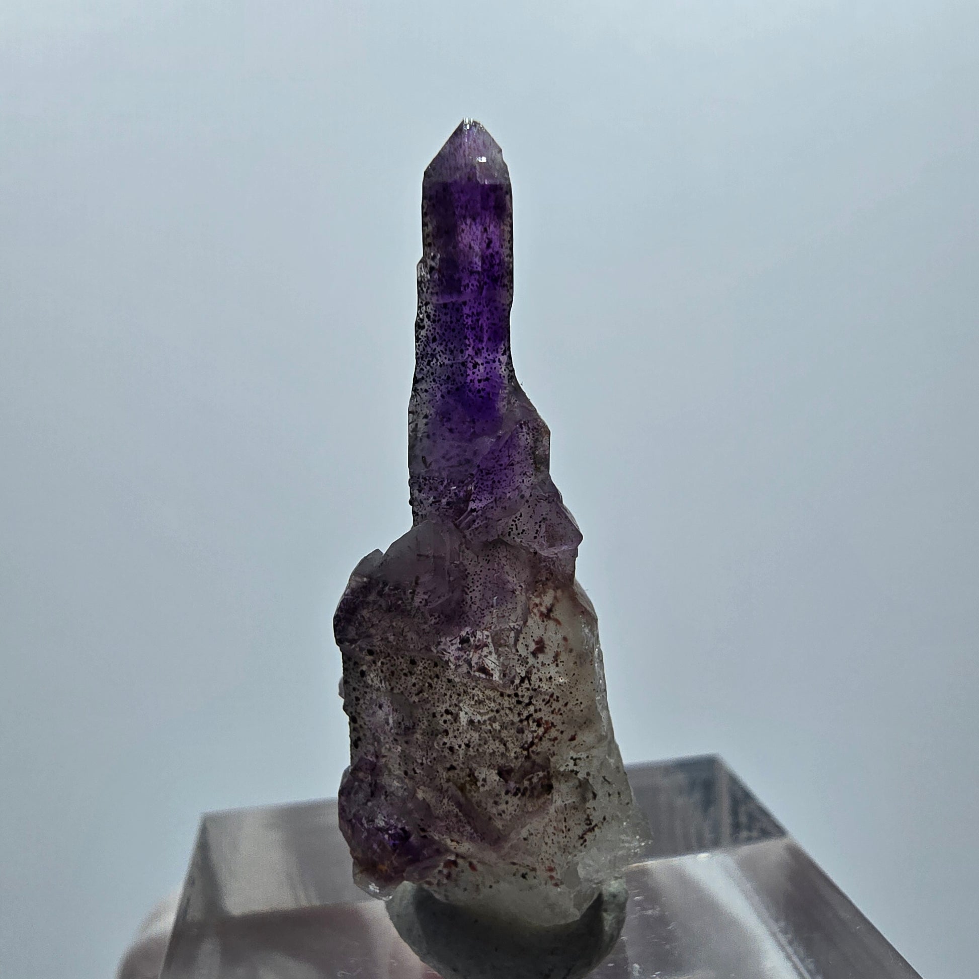 Diese seltene Phantom Amethyst Zepter Spitze besticht durch ihre klare, lila-weiße Transparenz mit wunderschönen Phantom-Einschlüssen im Inneren. Die einzigartige, zepterförmige Kristallspitze aus Brandberg, Namibia misst 31 x 11 x 9 mm und wiegt 2,55 g.