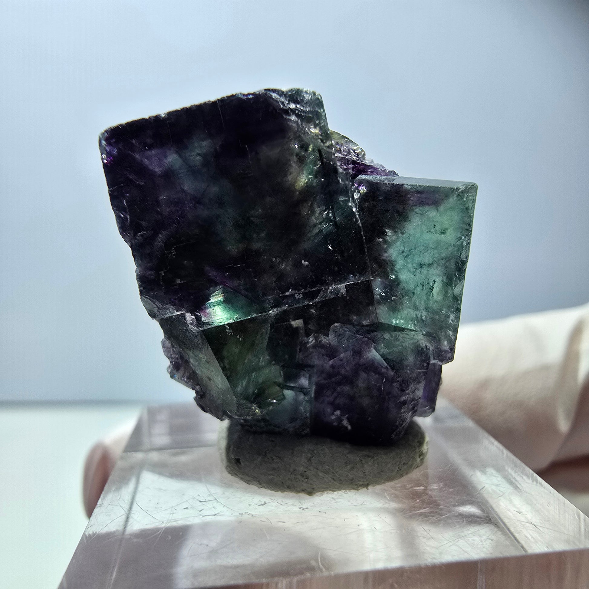 Entdecken Sie diesen außergewöhnlichen und seltenen grünen und lila Phantom Fluorit Würfel, der mit wunderschönen, durchsichtigen kubischen Kristallen begeistert. Diese einzigartige Mineralprobe aus Okorusu, Namibia, zeichnet sich durch eindrucksvolle Phantome im Inneren der Kristalle aus, die bei Licht besonders schön zur Geltung kommen. Der Fluorit gilt als Symbol für Klarheit und geistige Entwicklung, und dieser Würfel ist nicht nur ein wunderbares Sammlerstück, sondern auch ein faszinierendes Schmuckstück für jeden Naturliebhaber.