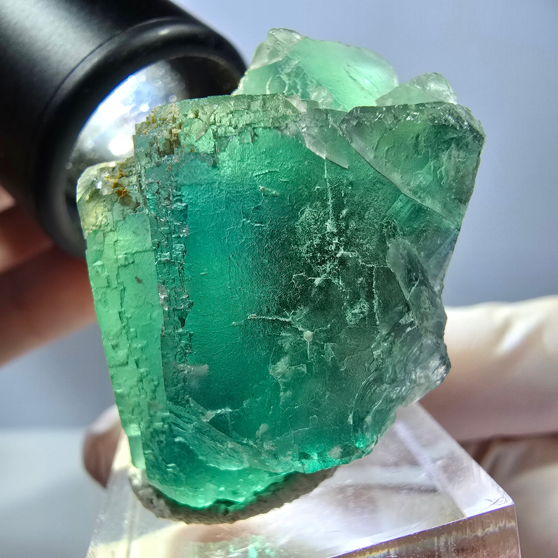 Entdecken Sie diese exquisite seltene grün transparente Fluorit Würfel Stufe aus Okorusu, Namibia. Diese edlen Kristalle zeichnen sich durch ihre faszinierenden inneren Phantome aus, die dem Stück eine einzigartige und mystische Schönheit verleihen. Die kristalline Struktur ist nicht nur ästhetisch ansprechend, sondern auch ein wunderbares Beispiel für die Schönheit der Natur.