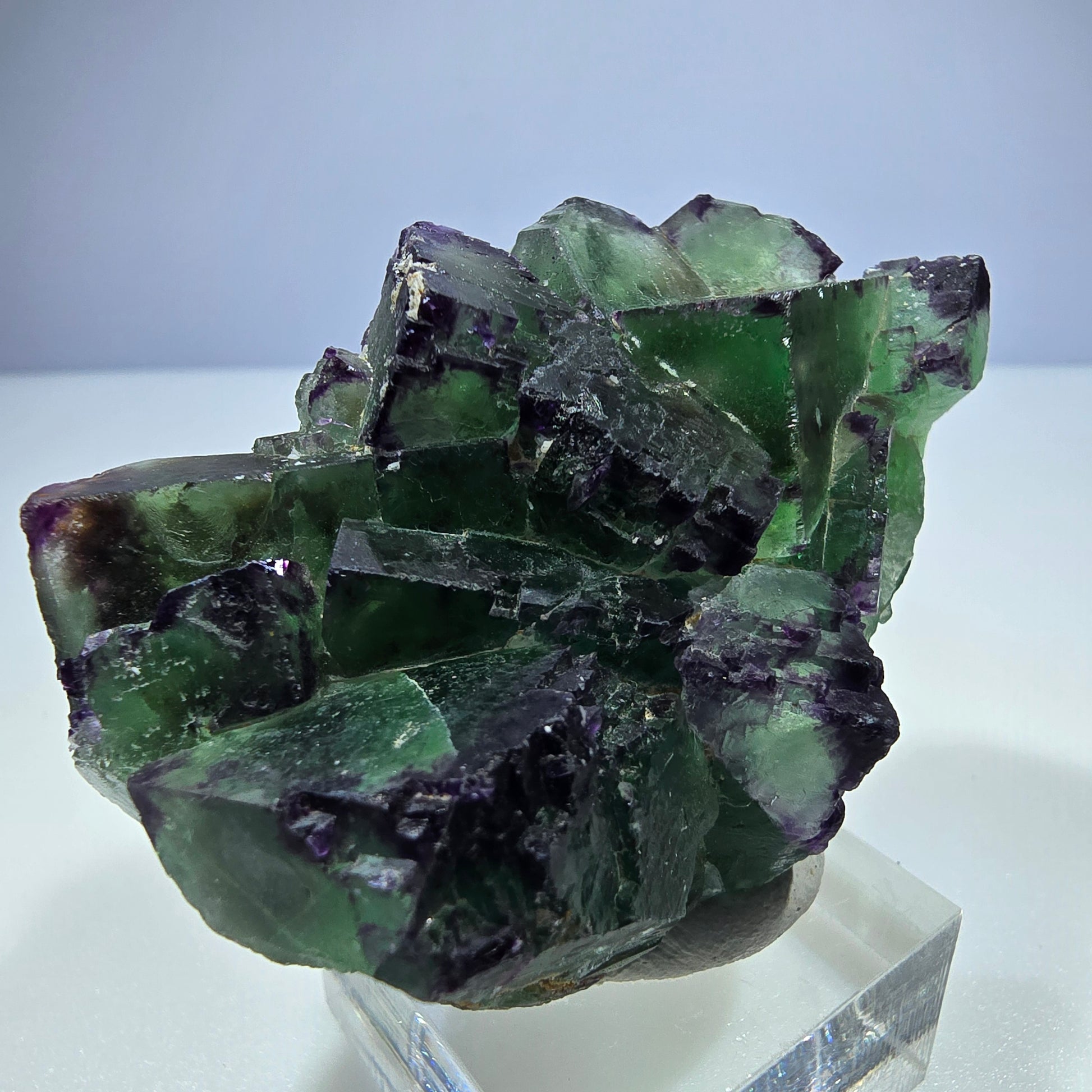 Entdecken Sie die Schönheit und Einzigartigkeit dieser seltenen grauen lila transparenten, zonalen Phantom Fluorit Würfel Stufe mit beeindruckenden Phantomen im Innenbereich. Jeder Würfel wurde sorgfältig aus dem faszinierenden Fundort Okorusu in Namibia gewonnen und weist eine exquisite Kombination aus grün-lila Farbtönen auf.