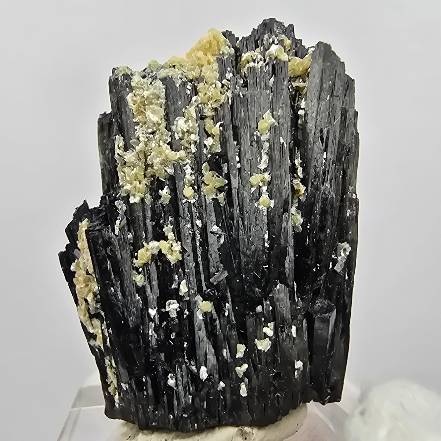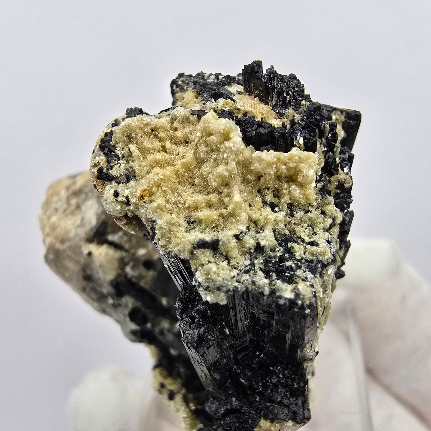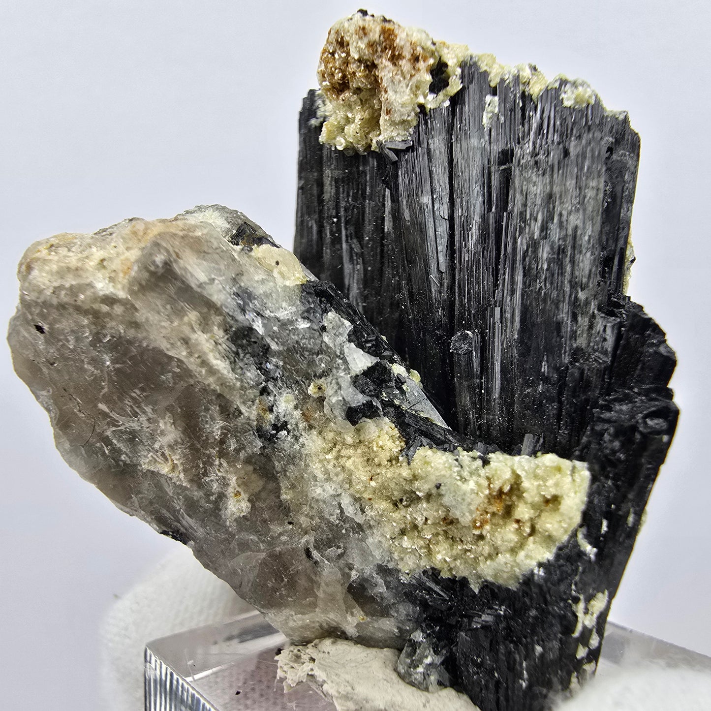 Diese außergewöhnliche Mineralienstufe kombiniert wunderschöne schwarze Schörl Turmalin Kristalle mit transparenten, grauen Rauchquarz Kristallen. Die harmonische Verbindung dieser beiden Mineralien entsteht in beeindruckender Schönheit, die sowohl Sammler als auch Liebhaber von Mineralien begeistert.