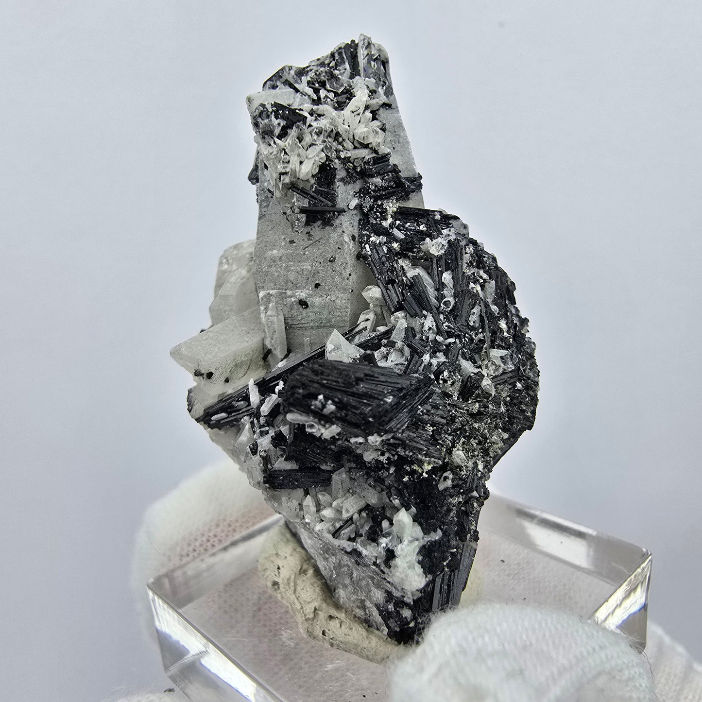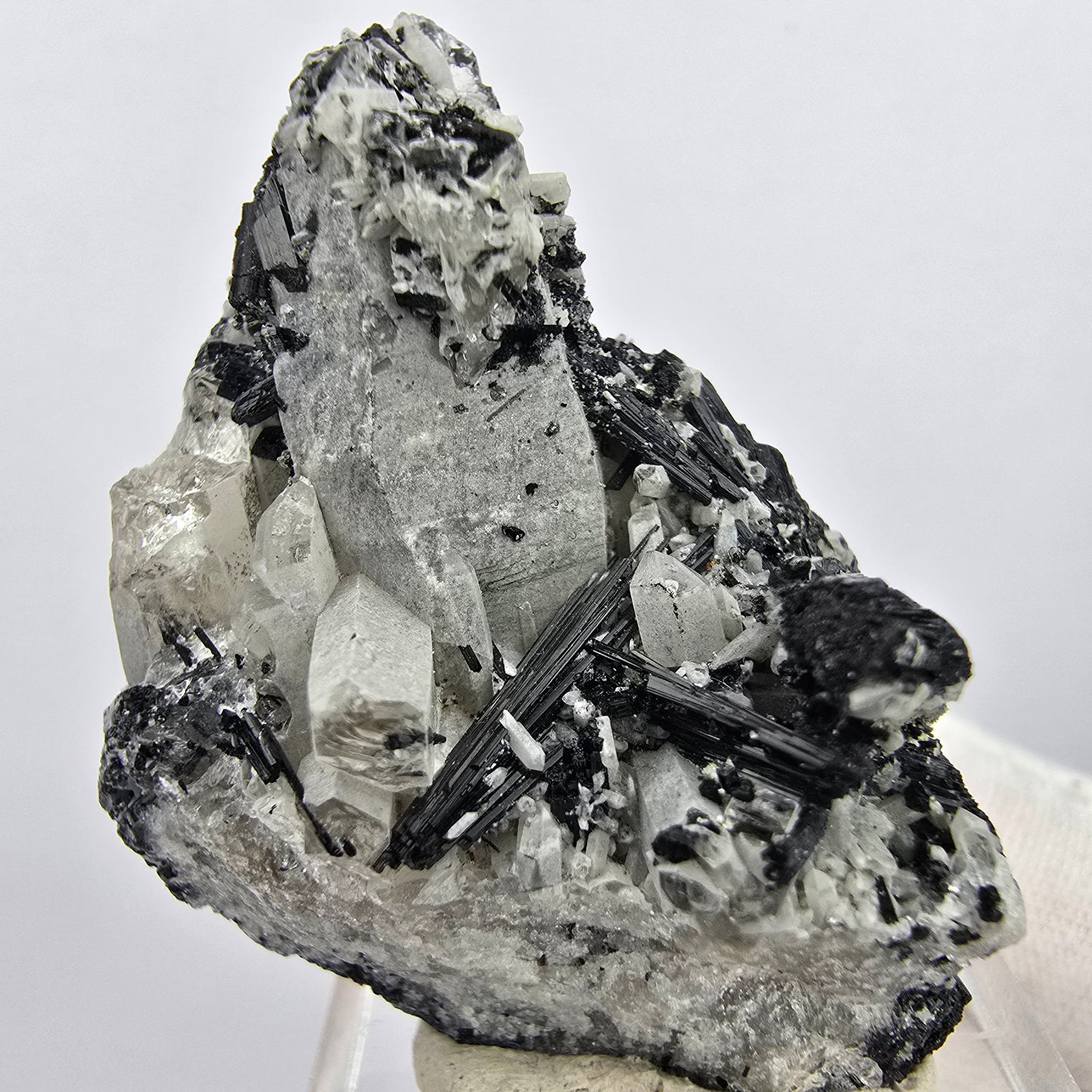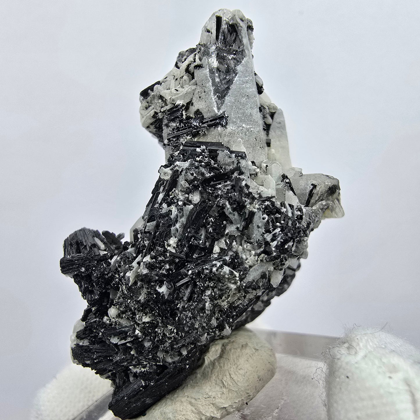 Entdecken Sie diese wunderschöne Mineralienstufe, die besondere Schönheit und Seltenheit vereint. Die Stufe beeindruckt mit ihren künstlerischen schwarzen glänzenden Schörl Turmalin Kristallen, die in direktem Kontrast zu den grau-transparenten Rauchquarz Kristallspitzen stehen. Jedes Stück erzählt eine eigene Geschichte aus der Natur und wird garantiert zum Blickfang in jeder Sammlung.
