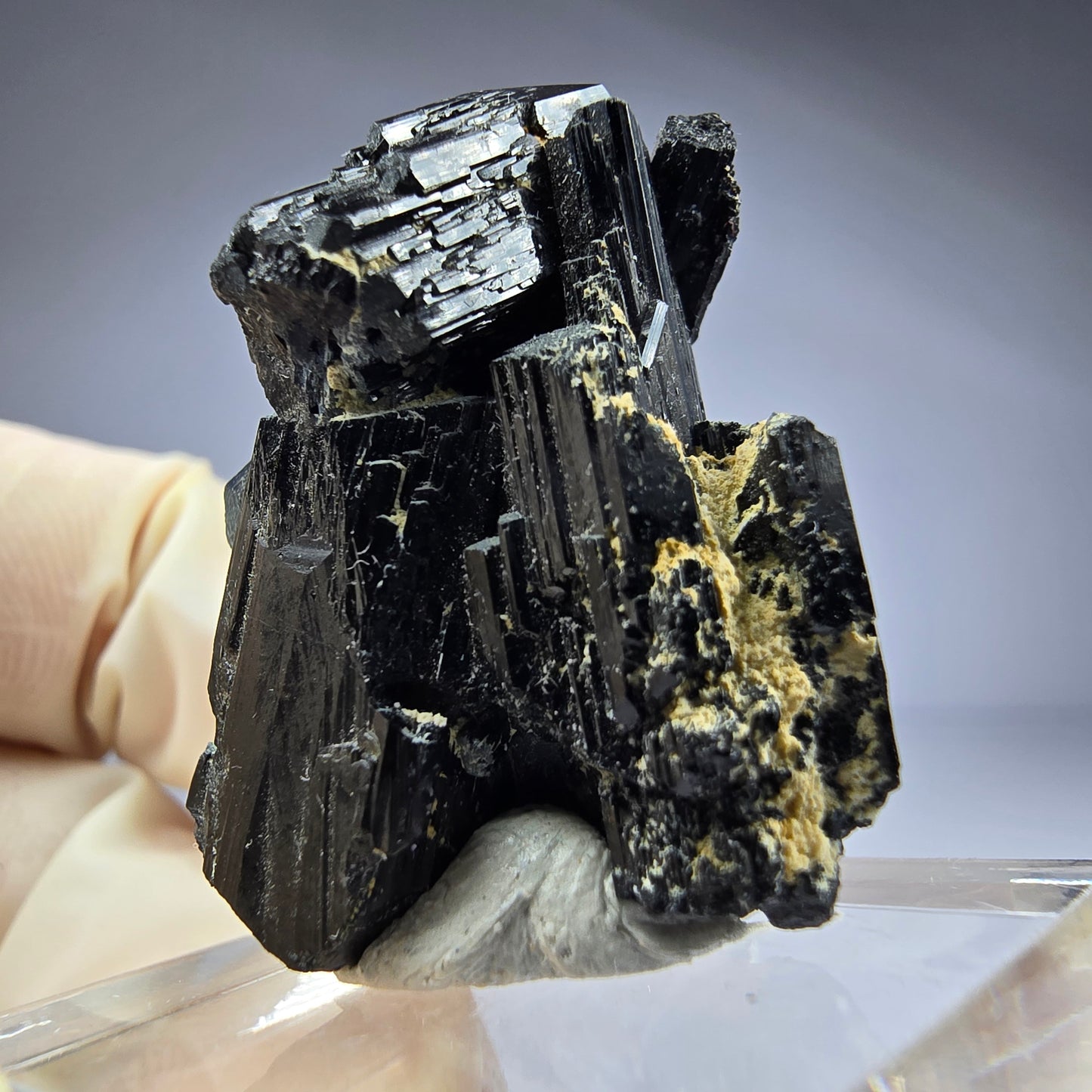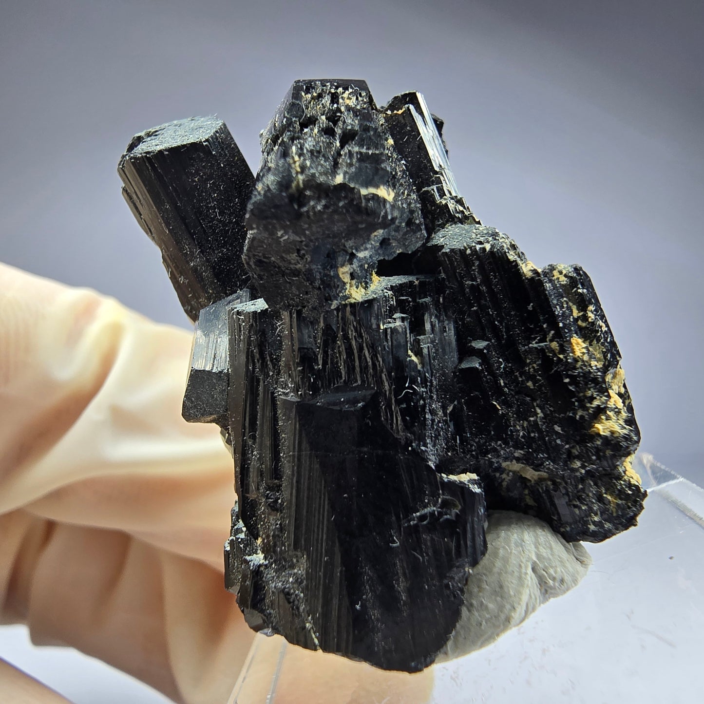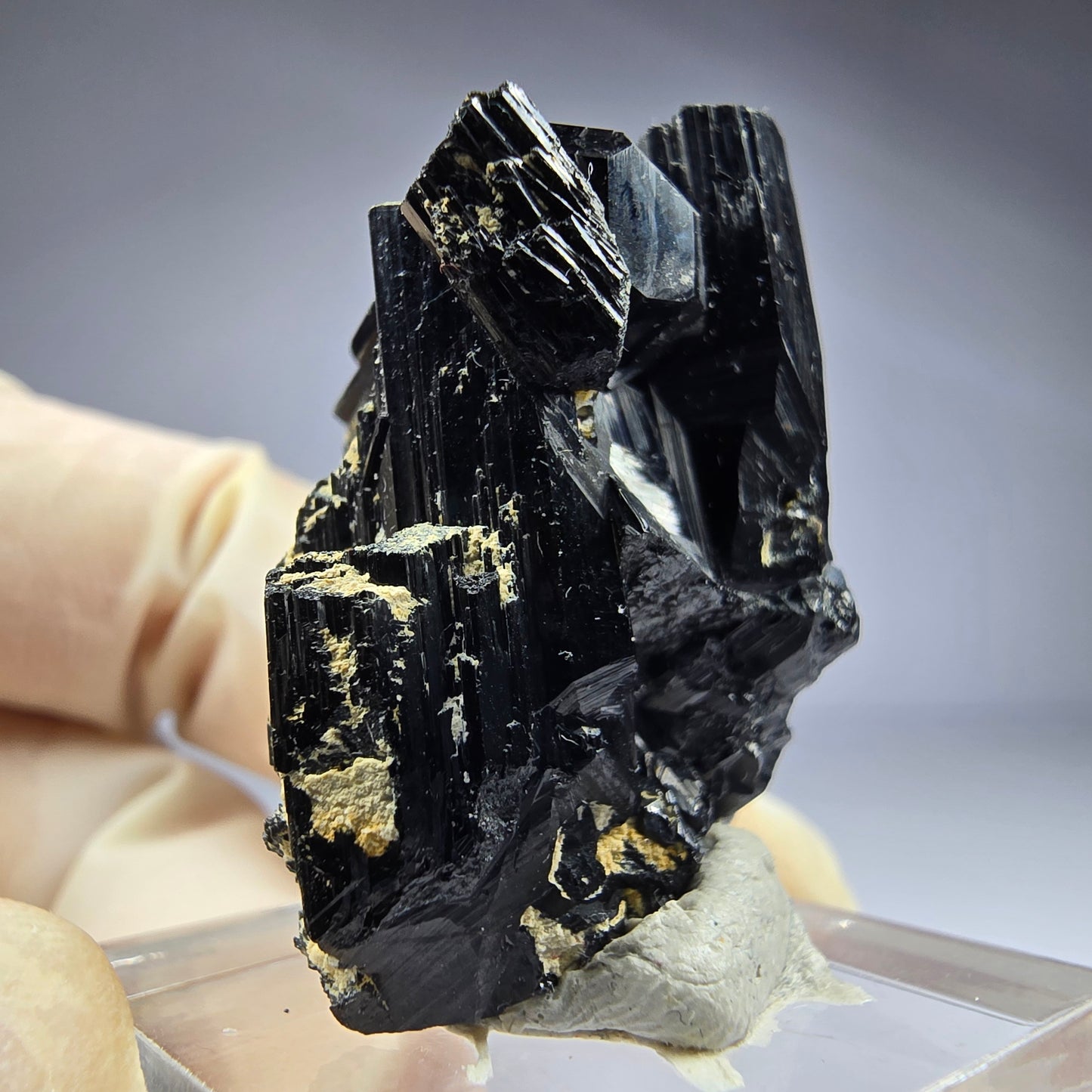 Schörl ist die häufigste Varietät der Turmalingruppe und zeichnet sich durch seine tiefschwarze Farbe aus. Die gut ausgebildeten Kristalle dieser Stufe bieten einen faszinierenden Einblick in die Kristallstruktur und geologischen Prozesse, die zu ihrer Entstehung geführt haben.