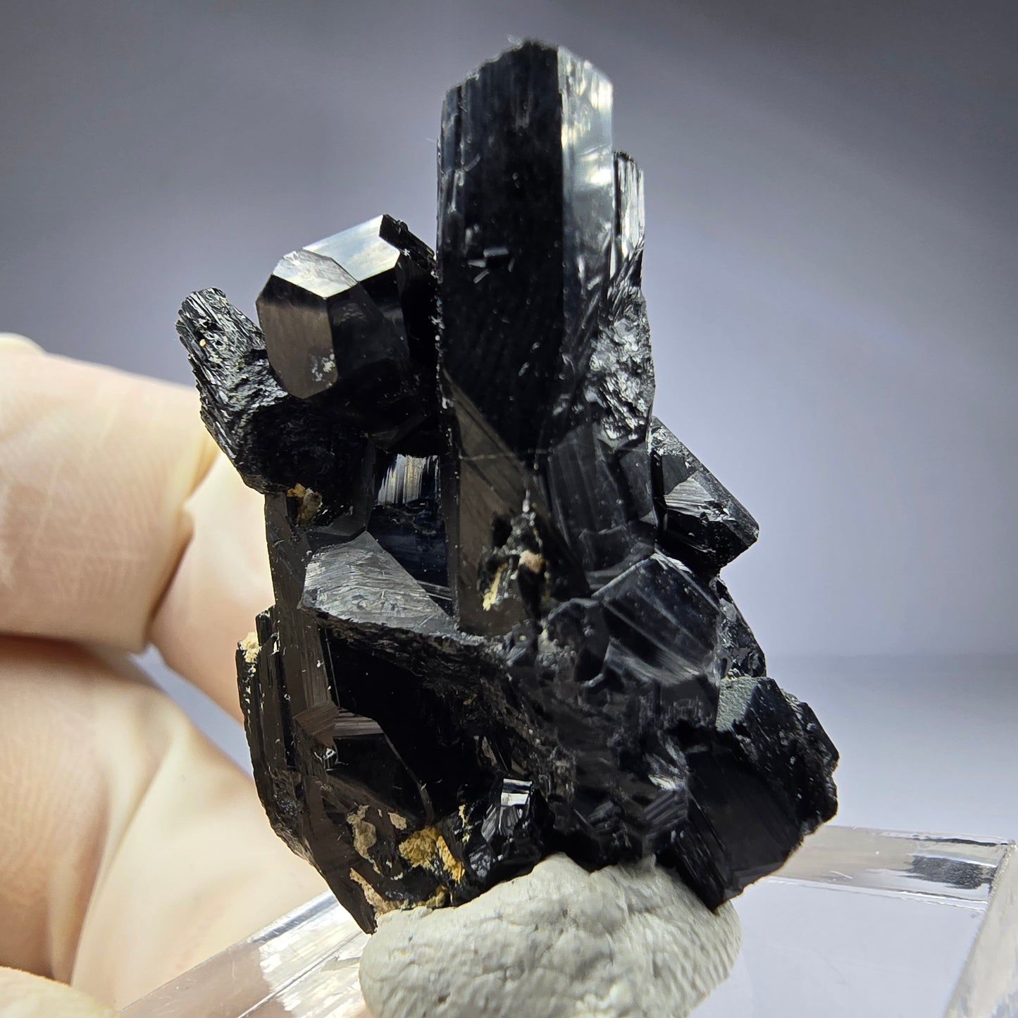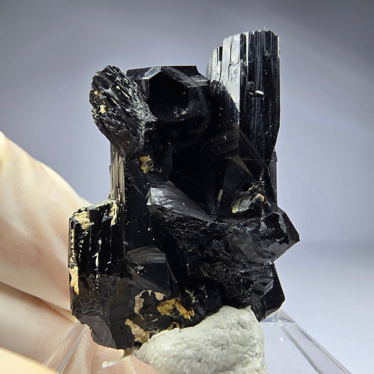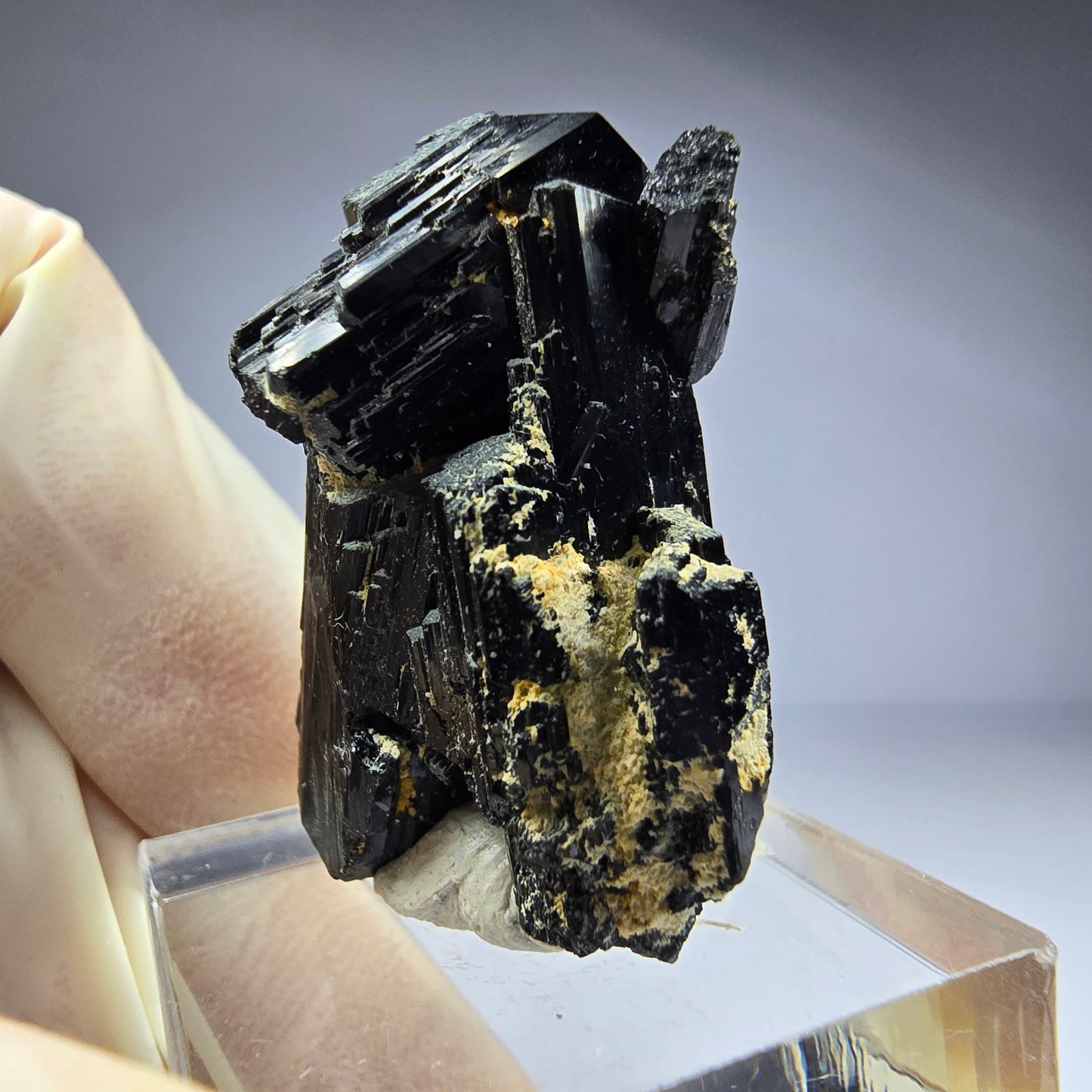 Schörl ist die häufigste Varietät der Turmalingruppe und zeichnet sich durch seine tiefschwarze Farbe aus. Die gut ausgebildeten Kristalle dieser Stufe bieten einen faszinierenden Einblick in die Kristallstruktur und geologischen Prozesse, die zu ihrer Entstehung geführt haben.