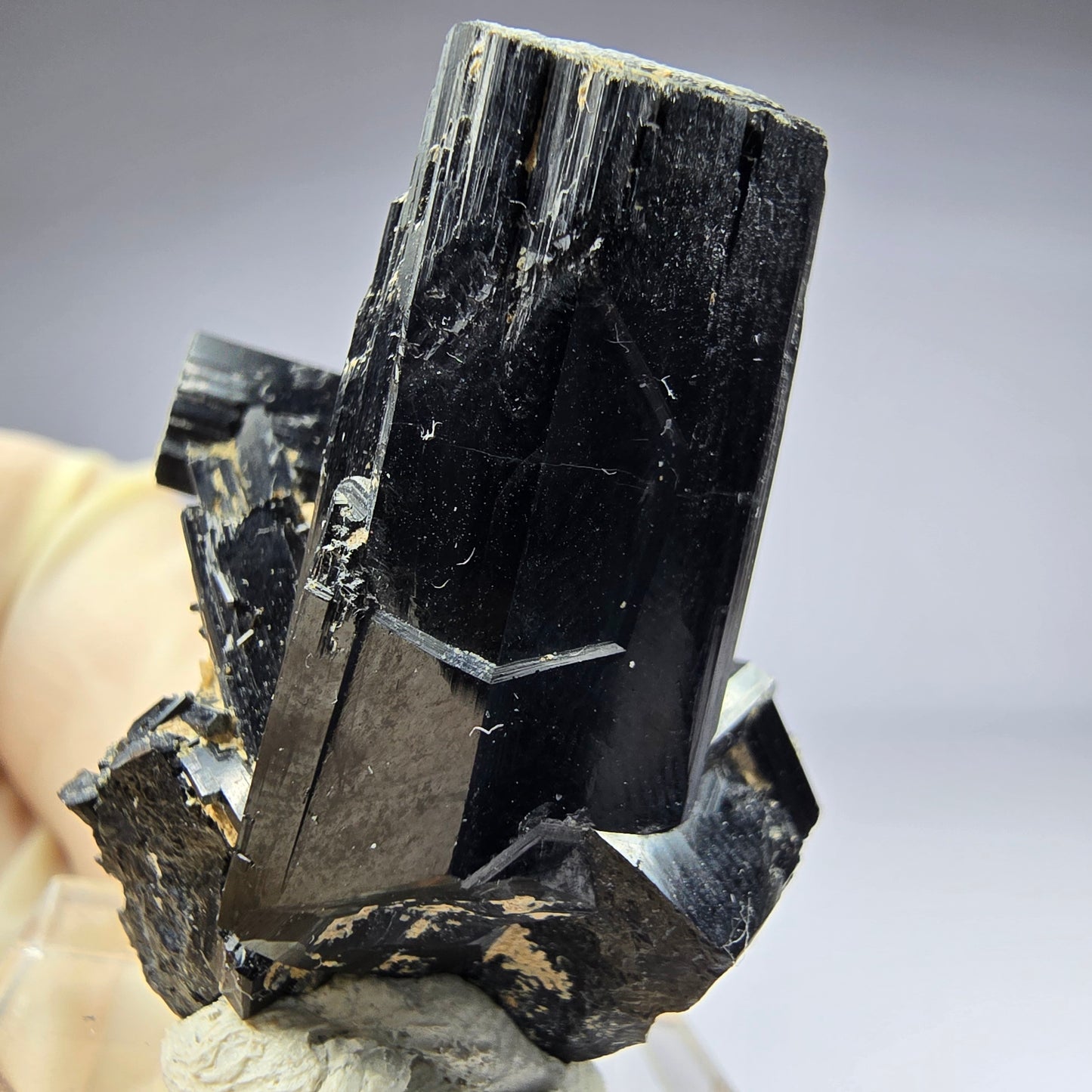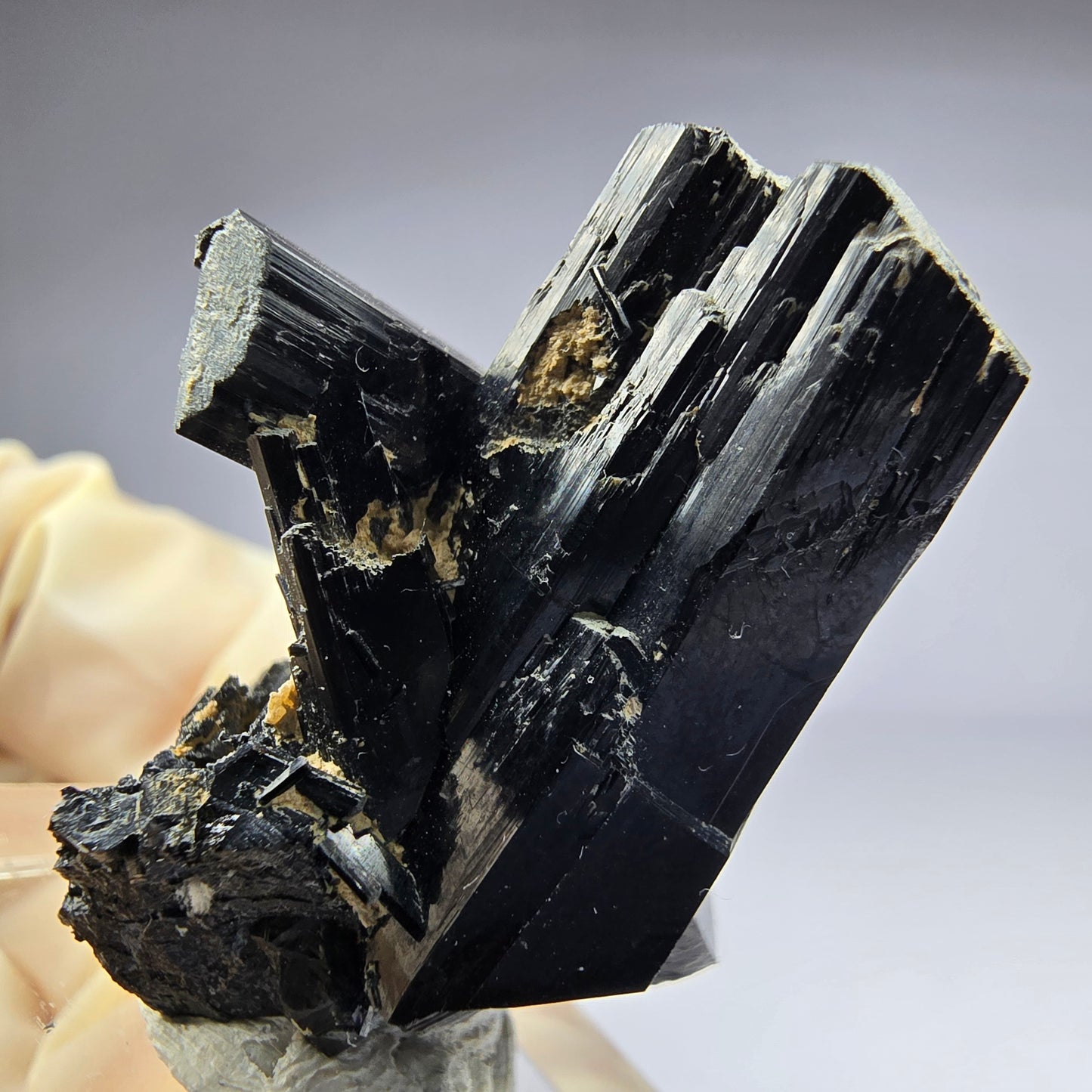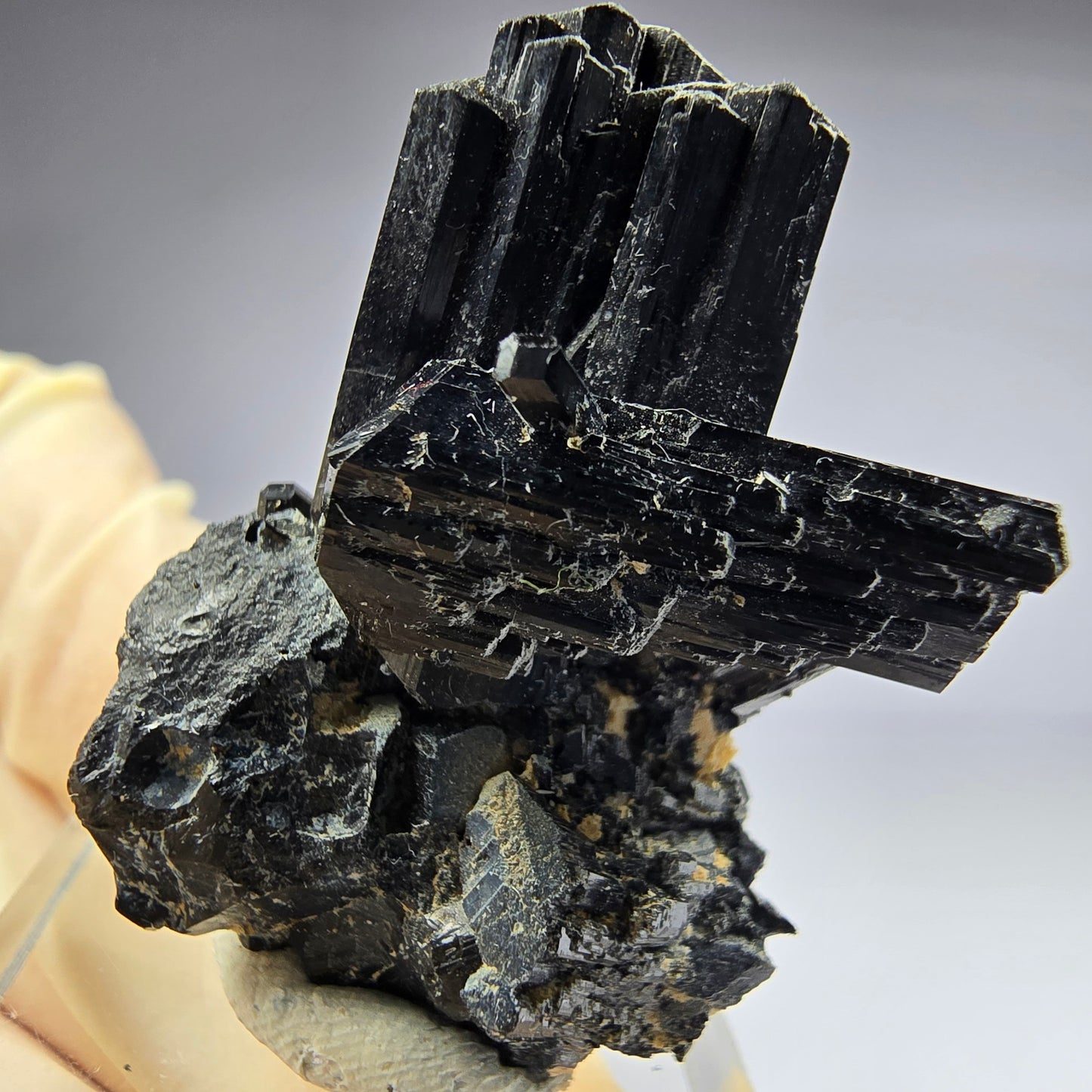 Diese beeindruckende Mineralienstufe präsentiert sich mit ausgeprägten, länglichen und schwarz glänzenden Schörl-Turmalin-Kristallen. Der Schörl, eine schwarze Varietät des Turmalins, besticht durch seinen metallischen Glanz und die charakteristische Streifung der Kristalle.