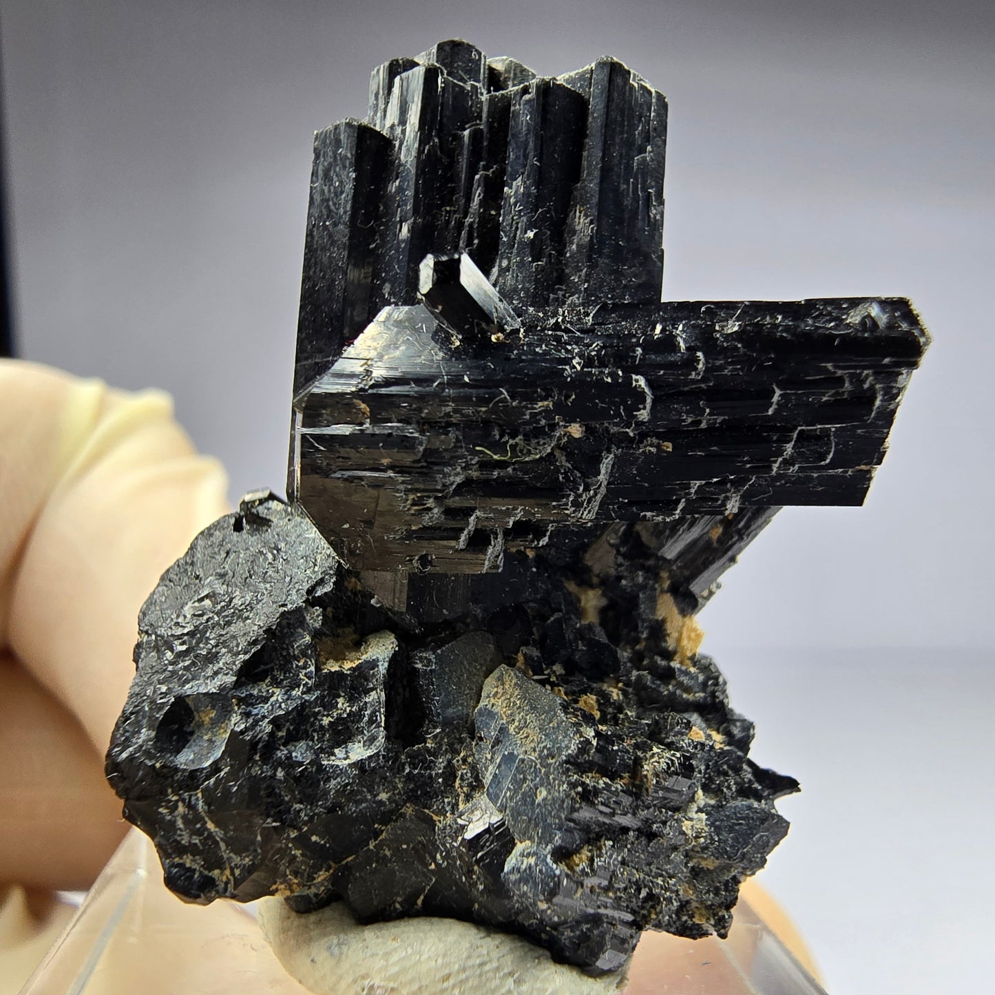 Mit Maßen von 36 x 27 x 20 mm und einem Gewicht von 21 g ist dieses Exemplar eine ideale Größe für Sammler, die Wert auf Qualität und Ästhetik legen. Die schwarzen Turmaline kontrastieren eindrucksvoll mit der helleren Matrix und machen diese Stufe zu einem echten Blickfang in jeder Mineraliensammlung.