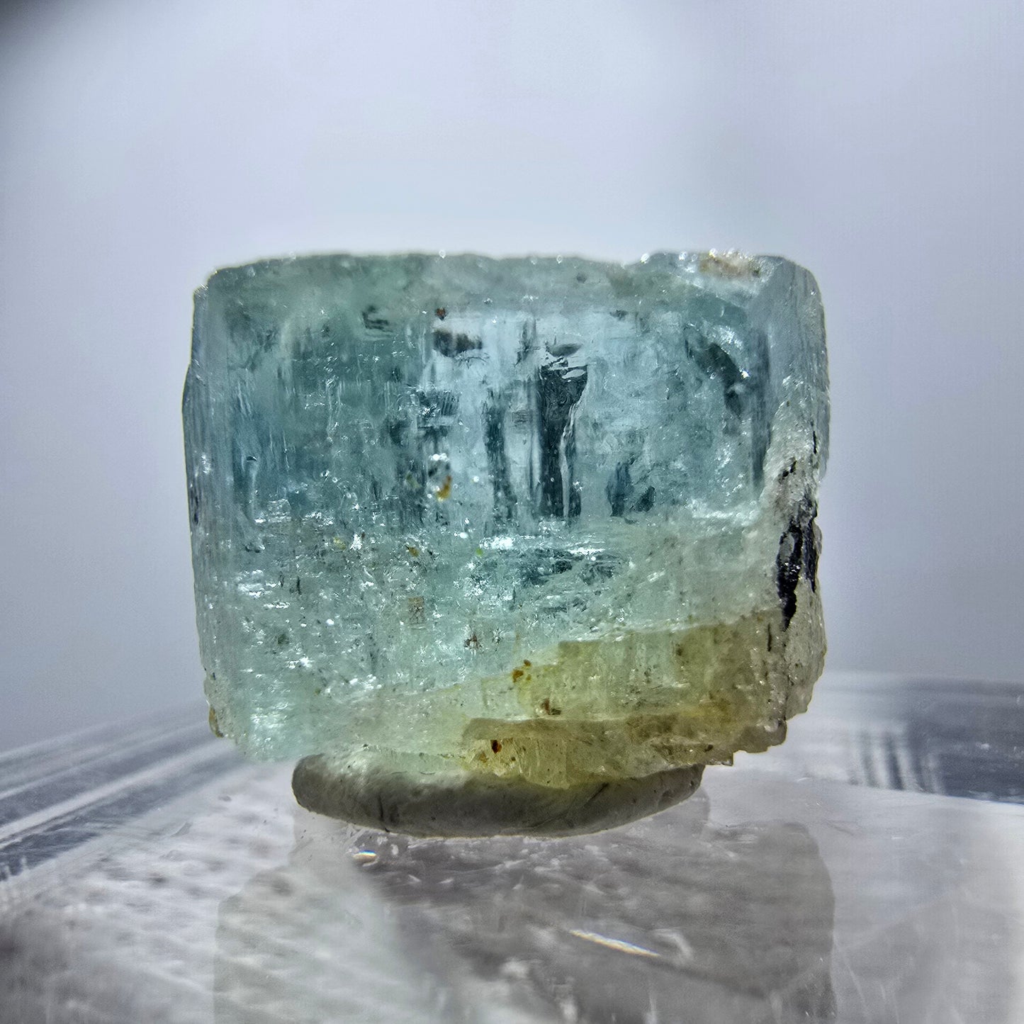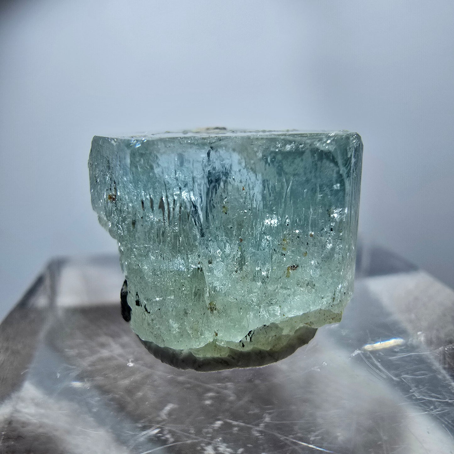 Entdecken Sie diesen außergewöhnlichen, klaren hellblau länglich gewachsenen Aquamarin Kristall, der harmonisch mit einigen schwarzen Schörl Turmalin Kristallen verwachsen ist. Diese Kombination aus Farben und Strukturen macht diesen Mineralienfund zu einem wahren Unikat. Jeder Kristall erzählt seine eigene Geschichte und bringt die Schönheit der Natur in Ihr Zuhause.