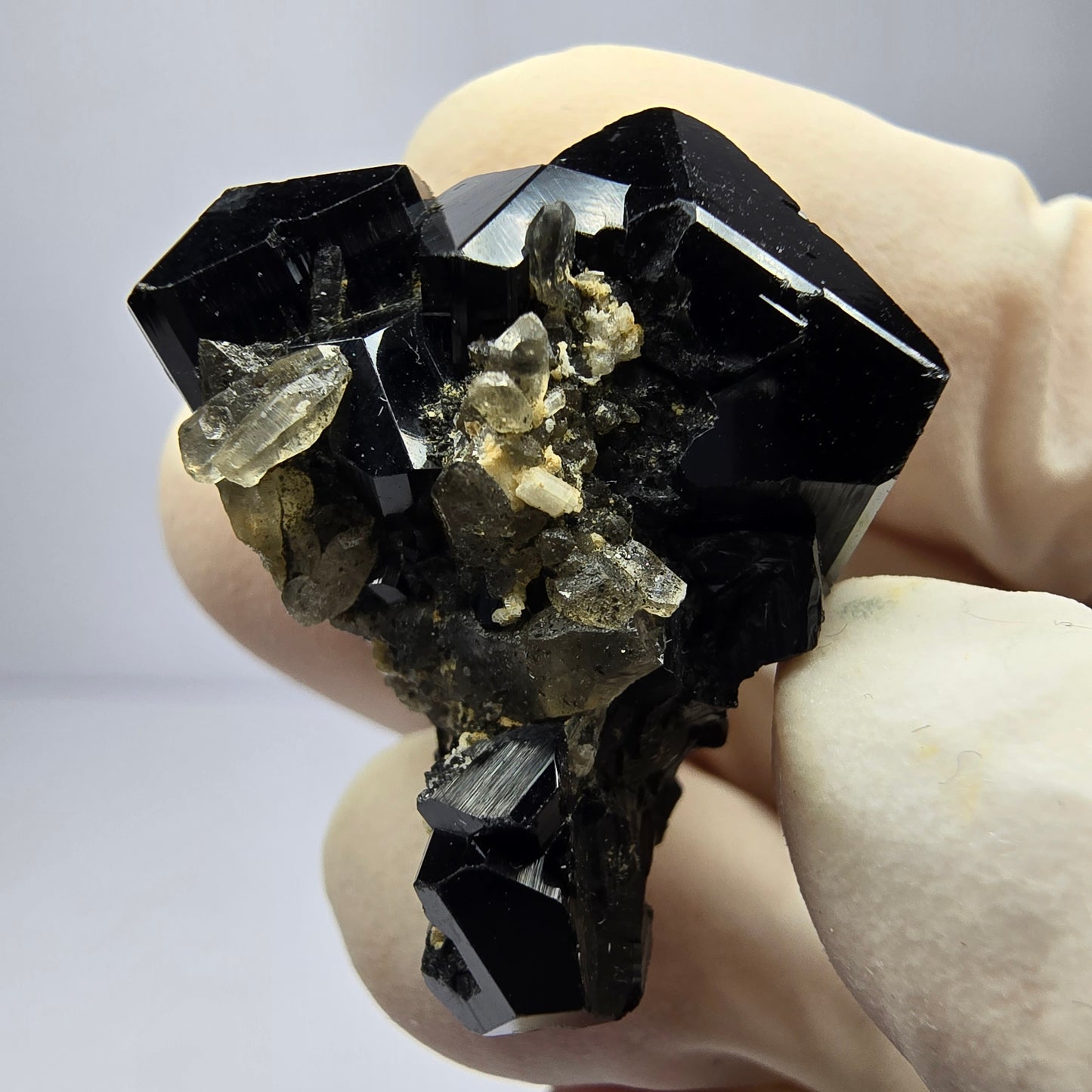 Entdecken Sie diese beeindruckende Mineralienstufe, die mit schwarz glänzenden, spiegelnden, symmetrischen Schörl Turmalinen und braun transparenten Rauchquarz Kristallspitzen verziert ist. Diese exquisite Kombination aus Mineralien macht das Stück zu einem wahren Blickfang für Sammler und Liebhaber von Naturwundern.