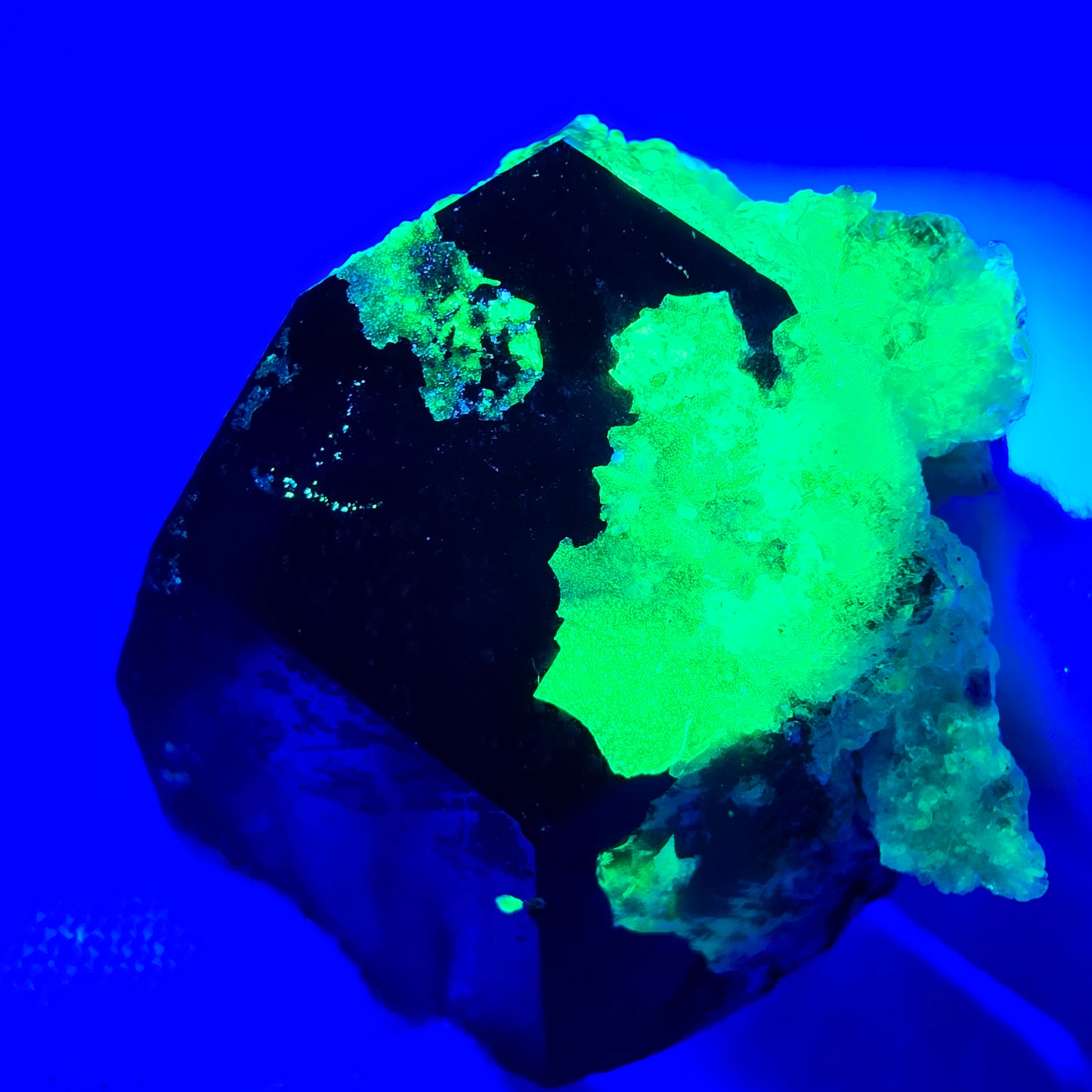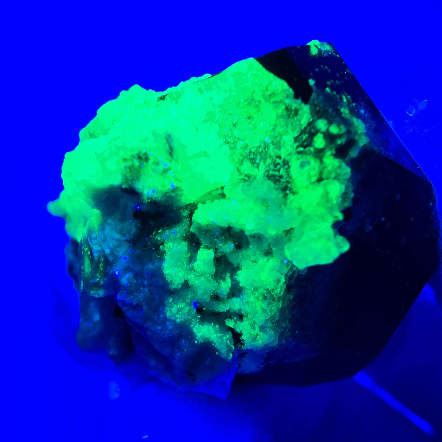 - Neongelbe Hyalit Kristalle unter UV Licht