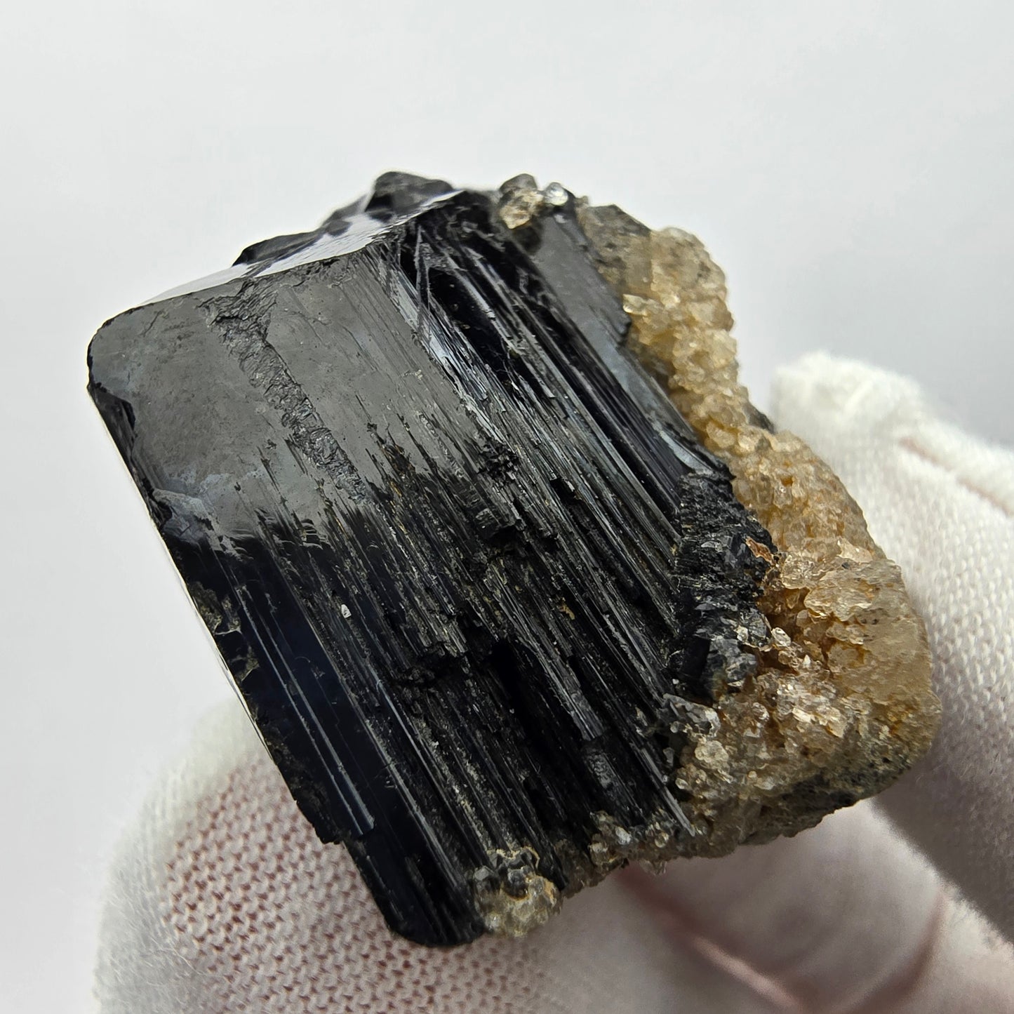 Entdecken Sie eine wunderschöne Mineralienstufe mit einem prächtigen schwarzen, glänzenden Schörl Turmalin Kristall, der symmetrisch gewachsen ist. Dieser beeindruckende Kristall wird von einigen braun transparenten Rauchquarz Kristallspitzen begleitet, die an einer Seite gewachsen sind. Ein faszinierendes Stück Natur, das in keiner Sammlung fehlen sollte!