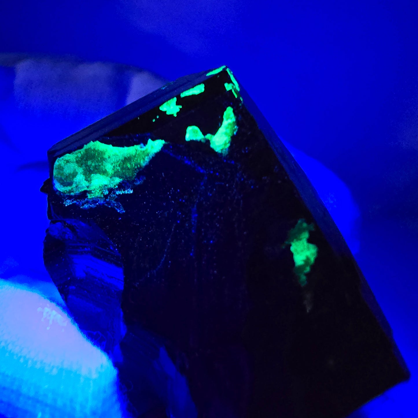 - Hyalit Kristalle, die unter UV Licht neongelb leuchten