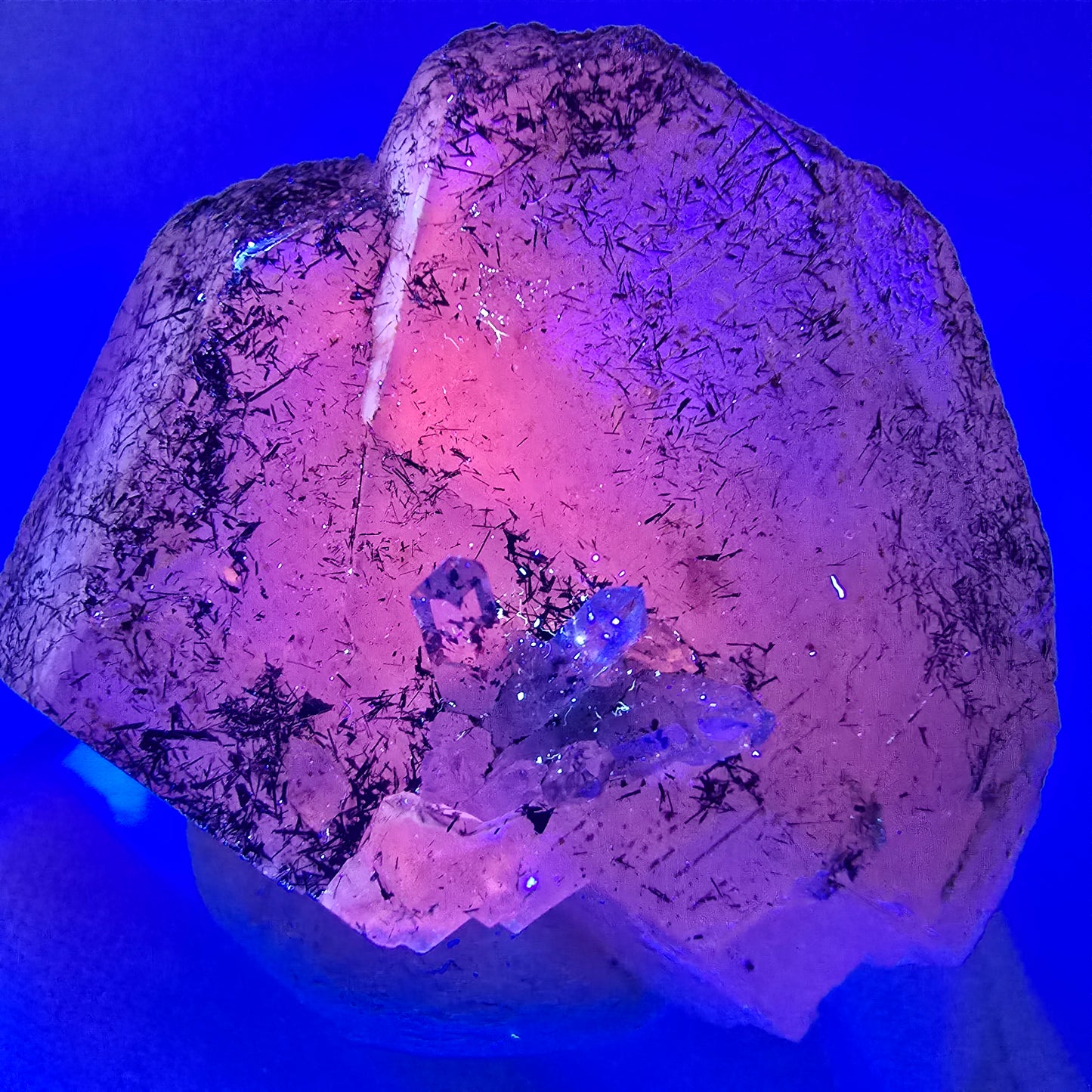 UV Calcit Kristall mit Harlekin Quarz und Schörl Turmalin