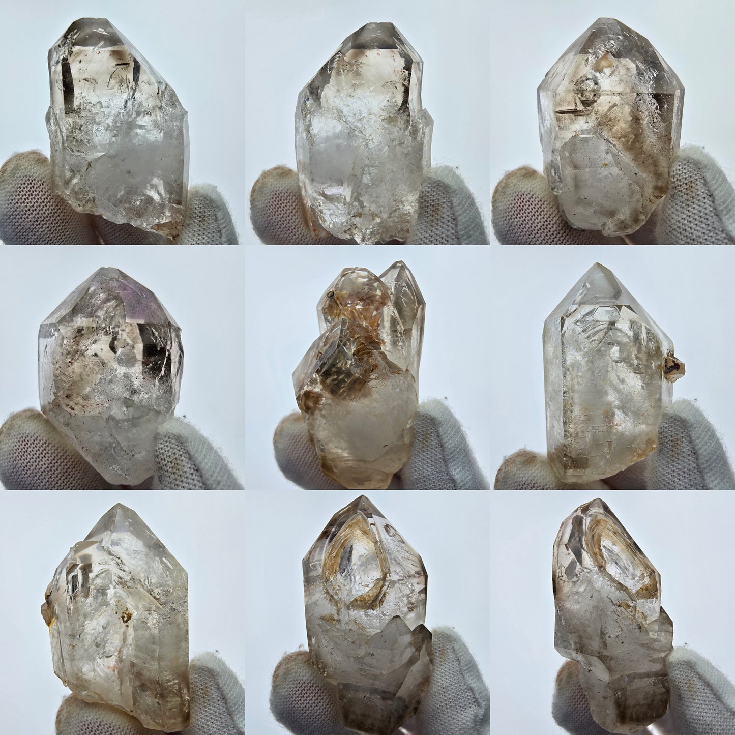 Einige der Kristalle zeigen eine Zepterform (Zepterquarz), während andere in der faszinierenden Doppelender-Kristallform (Doppelender Quarz, DT Quarz) präsentiert werden. Zudem sind einige Stücke mit schönen fensterförmigen Einschlüsse (Fensterquarz) versehen, die die Schönheit und Einzigartigkeit dieser Kristalle unterstreichen.
