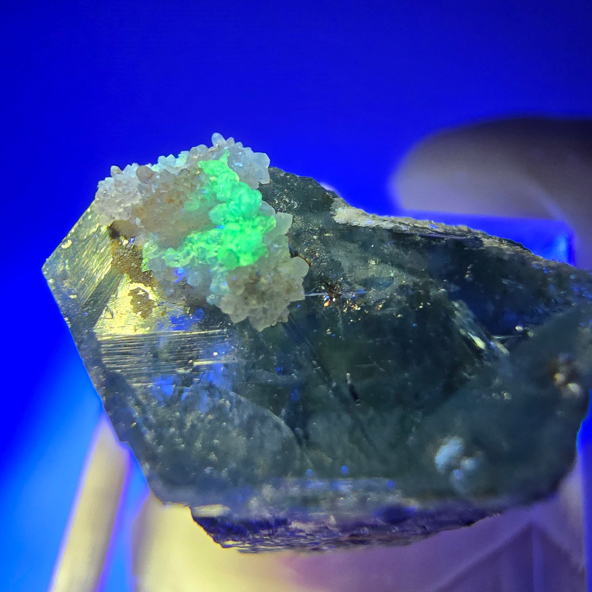 Seltener hellblauer, transparenter länglicher Aquamarin-Kristall aus dem Erongo in Namibia, bewachsen mit gelb metallisch glänzenden Muskovit-Kristallen, braun transparenten Rauchquarz-Kristallen und leuchtenden Hyalit-Opal-Kristallen unter UV-Licht.