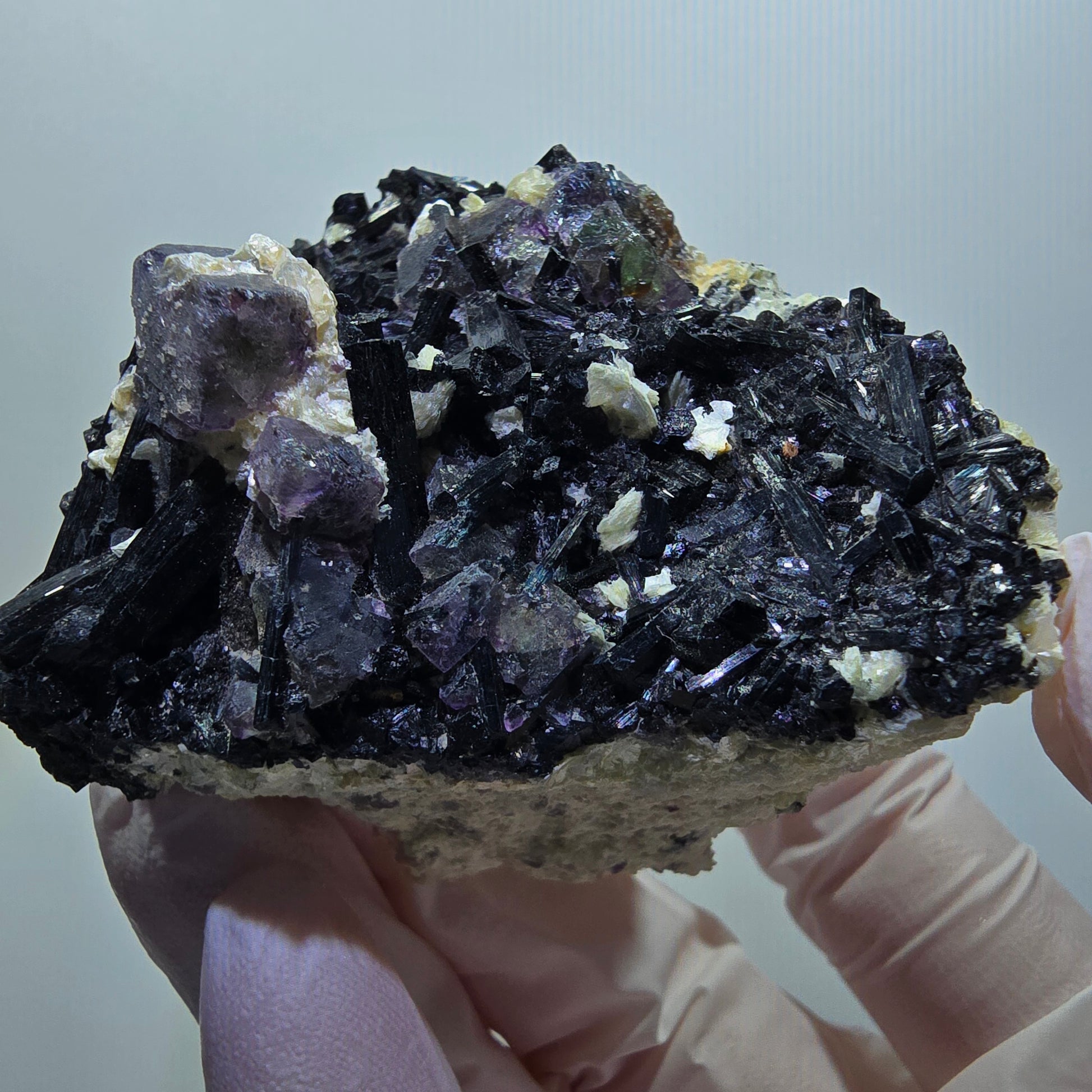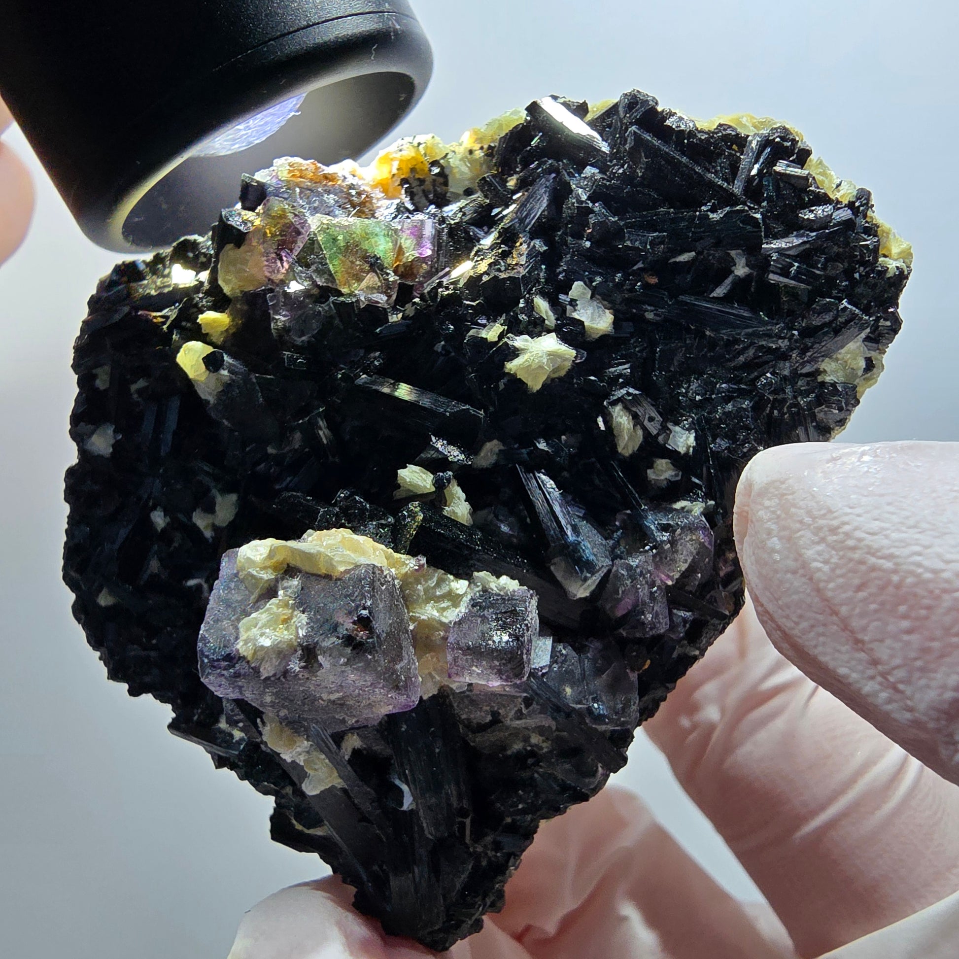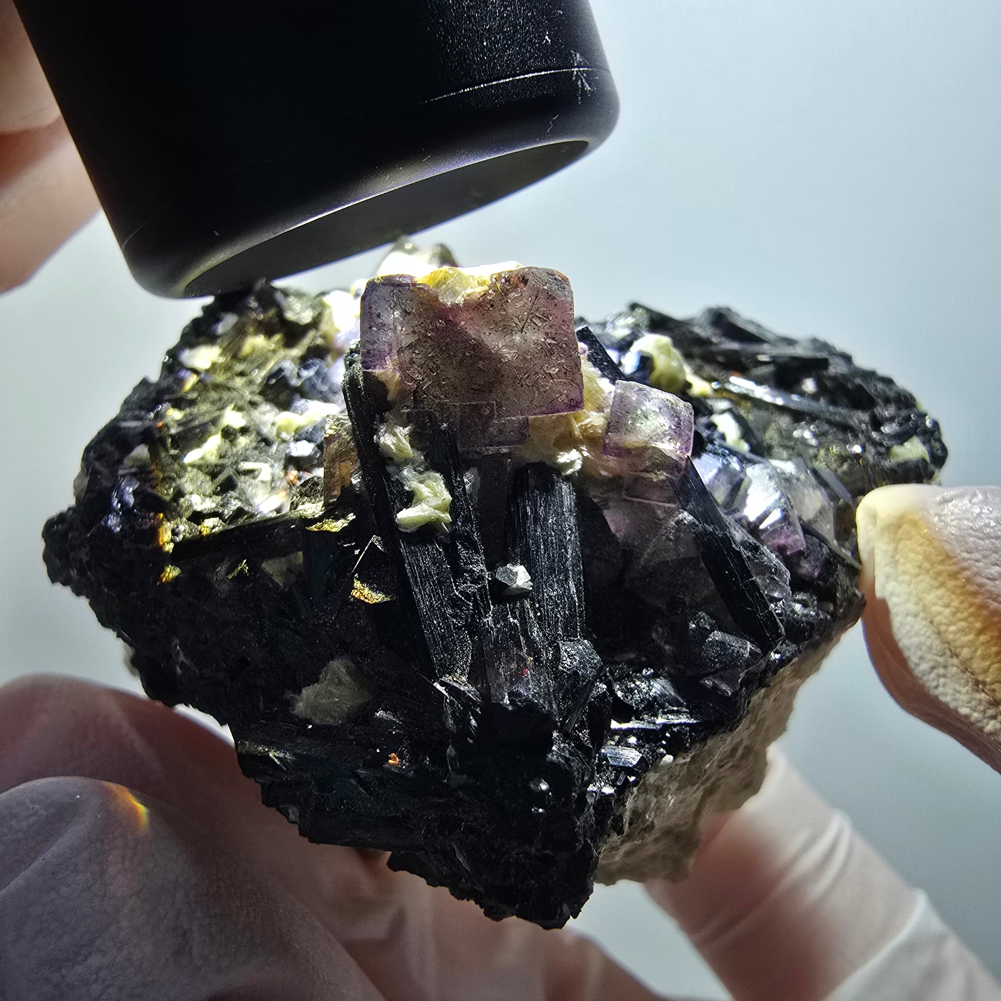 - Mineralien: Bunter Phantom Fluorit, Schörl Turmalin, Muskovit