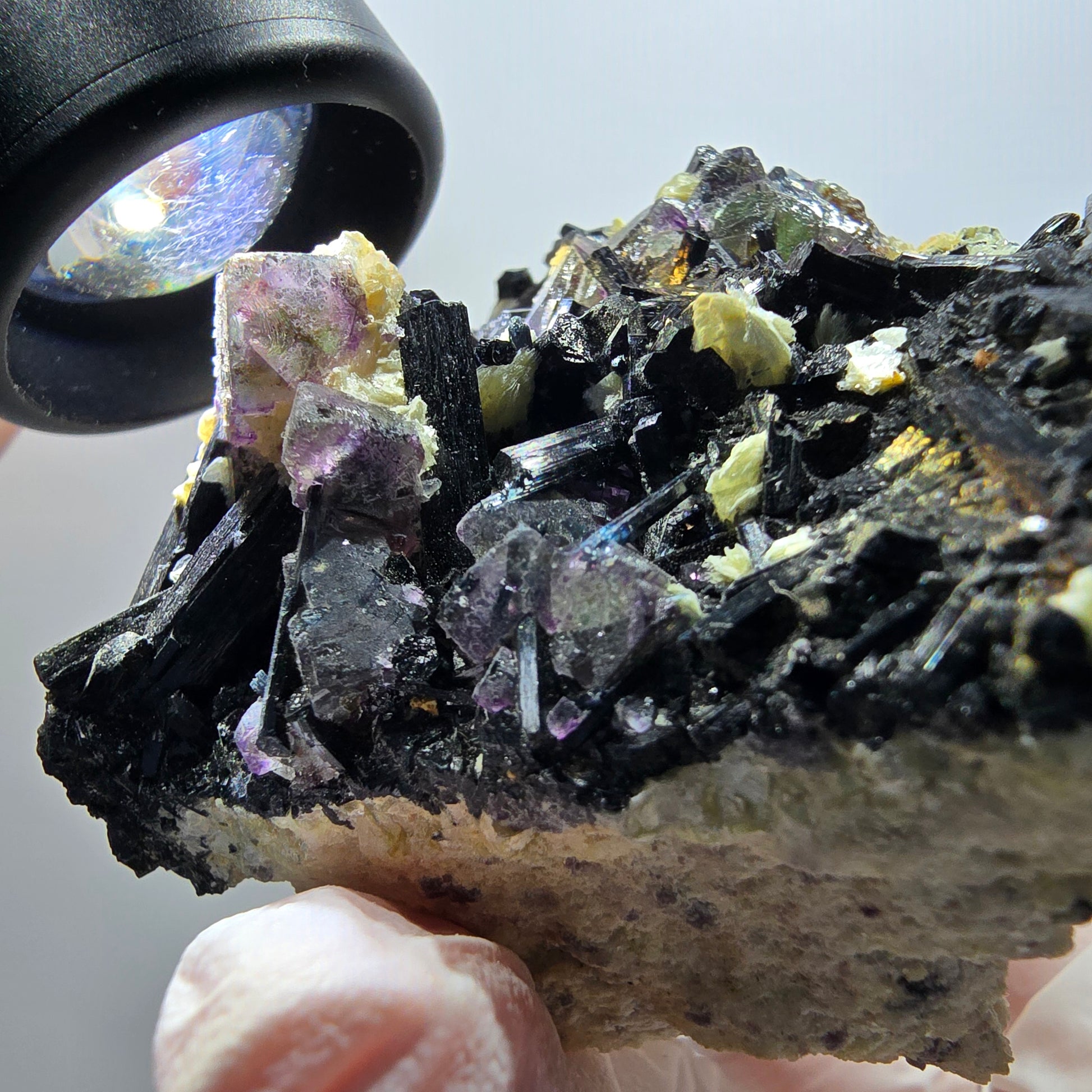 Entdecken Sie diese schöne Mineralienstufe mit bunten Phantom Fluorit-Würfeln in Grün, Lila, Braun, Gelb und Transparent, ergänzt durch gelb metallisch glänzende Muskovit-Kristalle und schwarze Schörl-Turmalin-Kristalle. Aus dem Erongo in Namibia, mit Maßen von 61x53x52 mm und einem Gewicht von 131 g. Die Phantome im Inneren der Fluorit-Kristalle sorgen für ein faszinierendes Farbenspiel und höchste Qualität.
