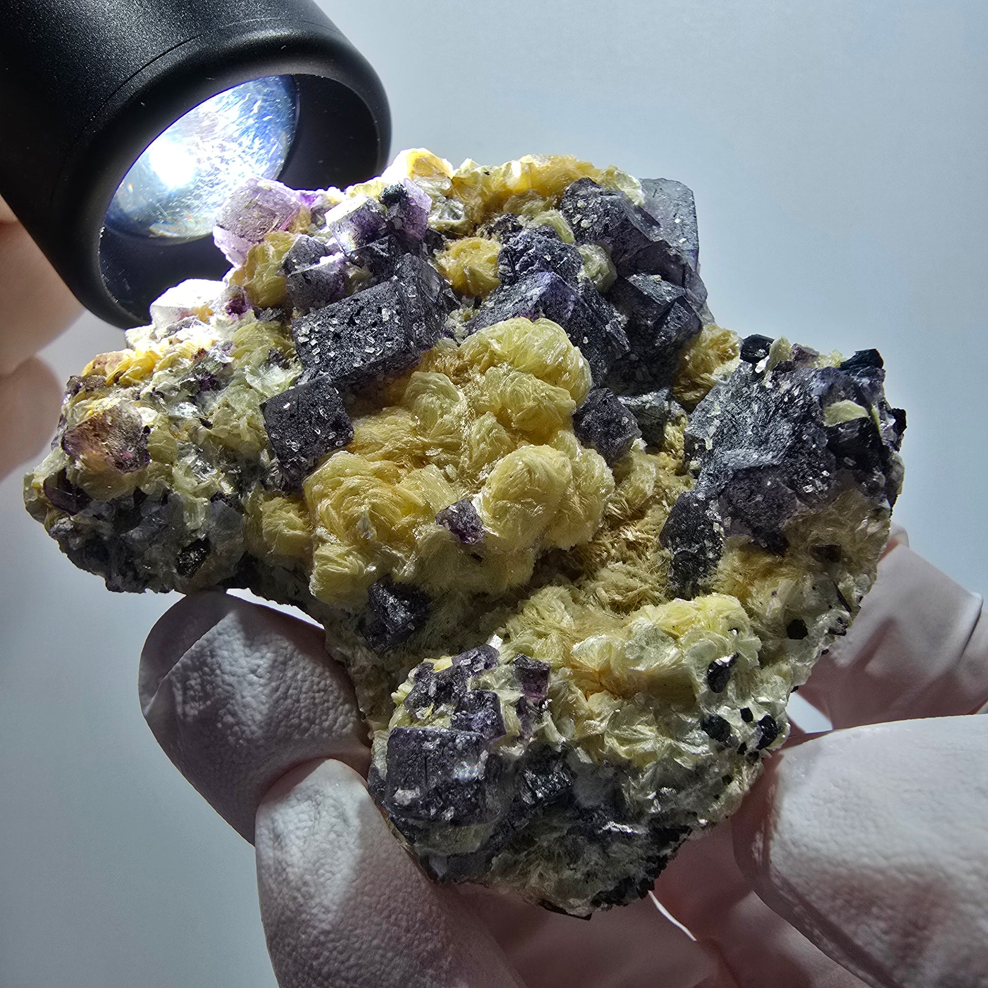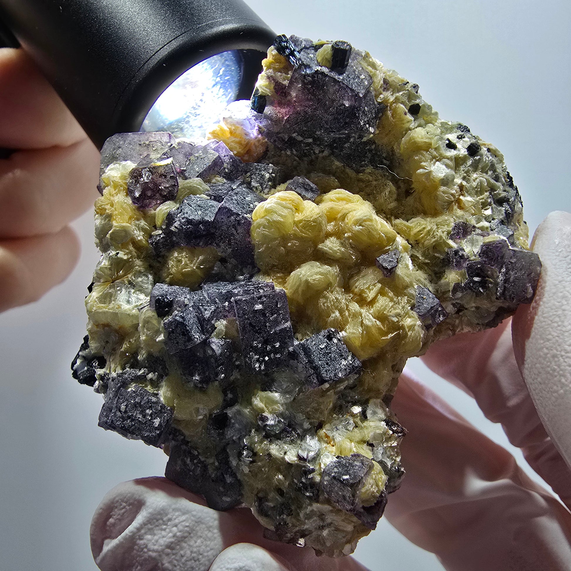 Entdecken Sie diese schöne Mineralienstufe mit bunten Phantom Fluorit-Würfeln in Grün, Lila, Braun, Gelb und Transparenz, ergänzt durch gelb metallisch glänzende Muskovit-Kristalle und schwarze Schörl-Turmalin-Kristalle. Maße: 62x51x35 mm, Gewicht: 98 g, Fundort: Erongo, Namibia, Angebots-Nr. 11701. Die atemberaubenden Phantome im Inneren der Fluorit-Kristalle machen diese Stufe zu einem echten Highlight für Sammler.