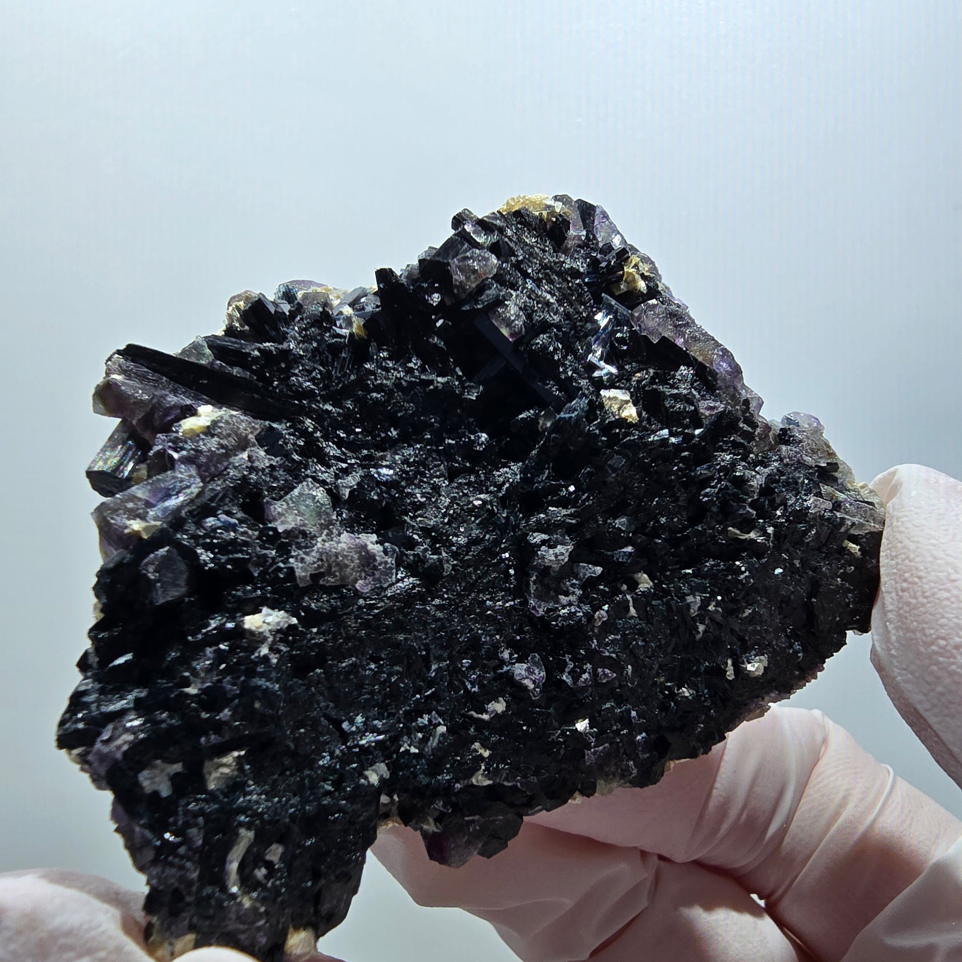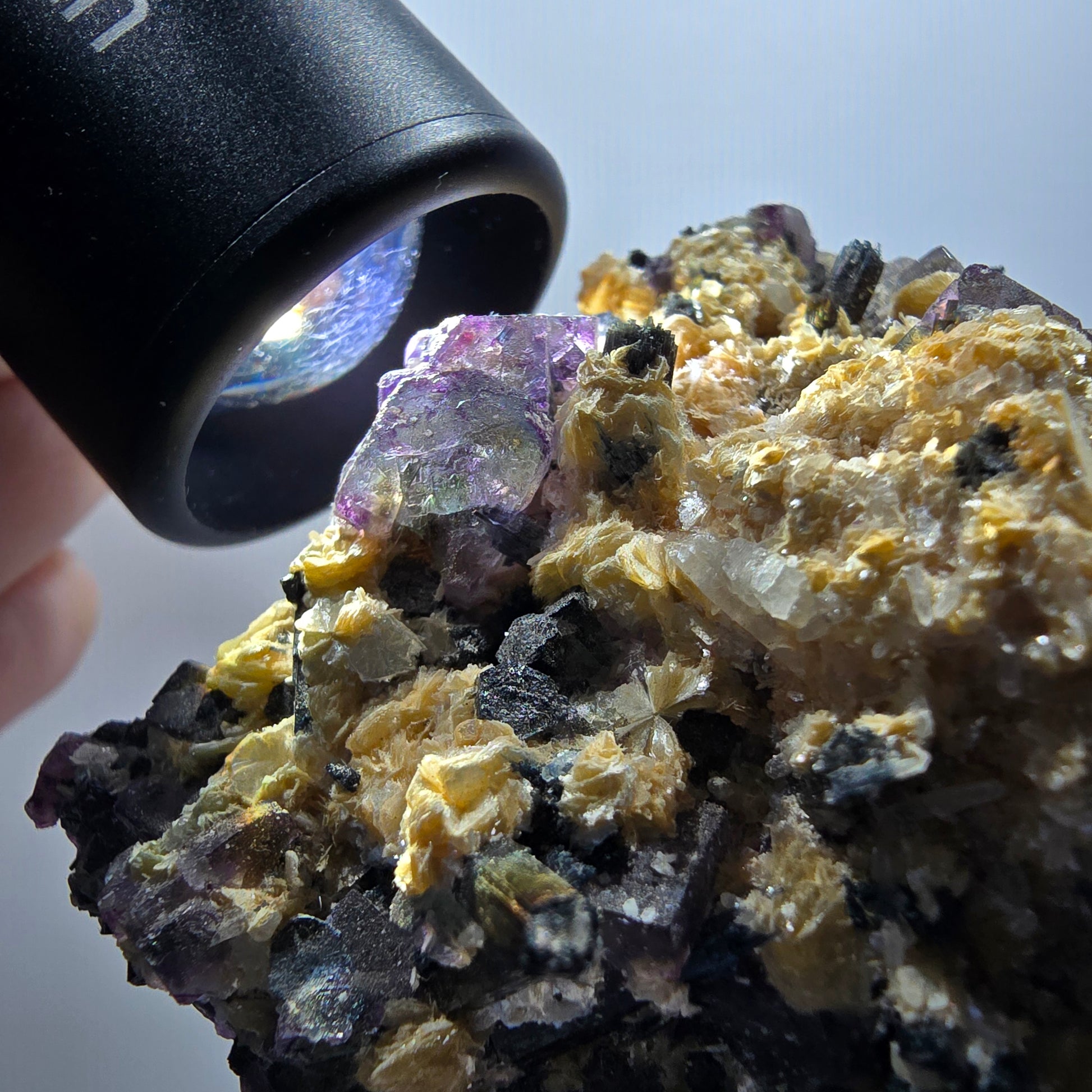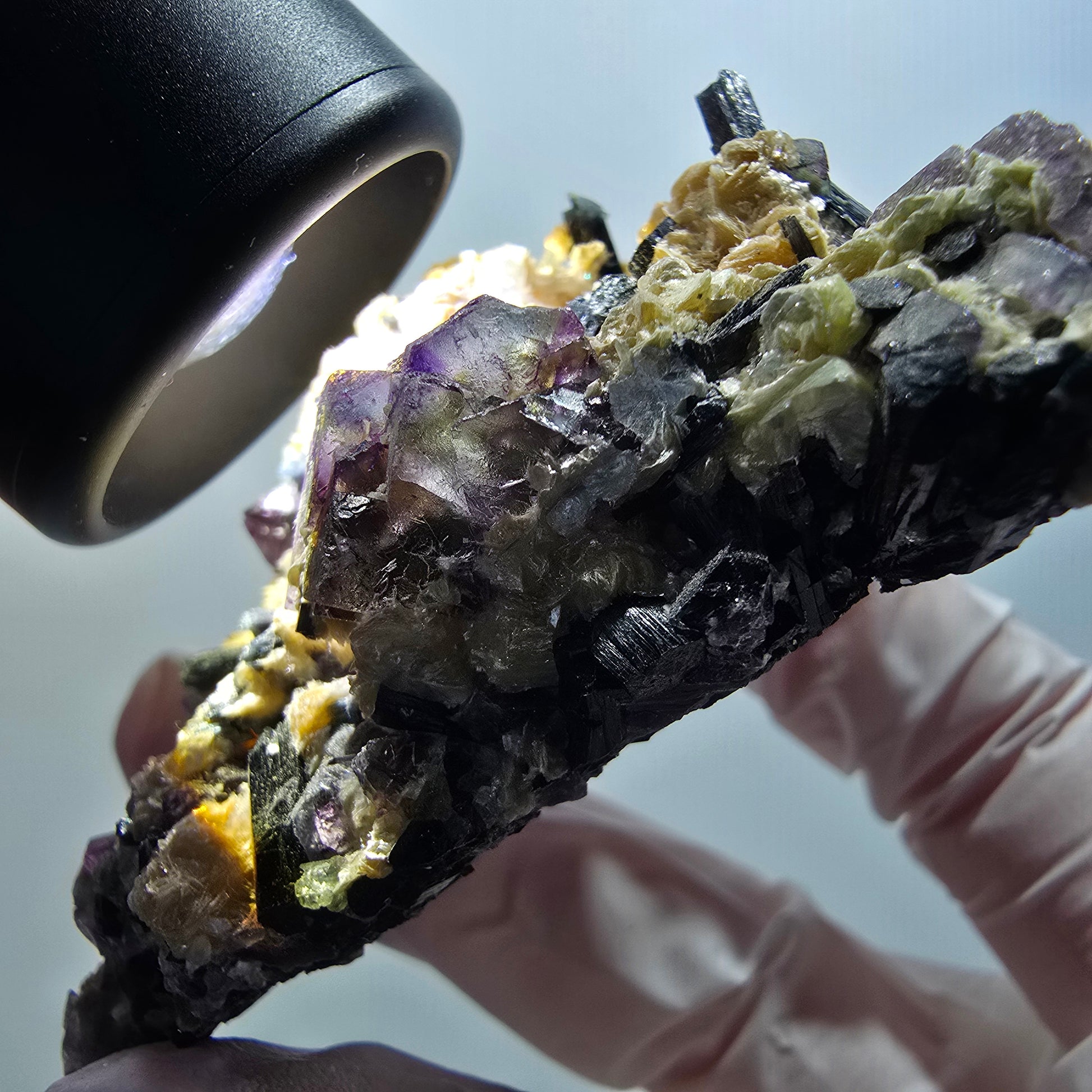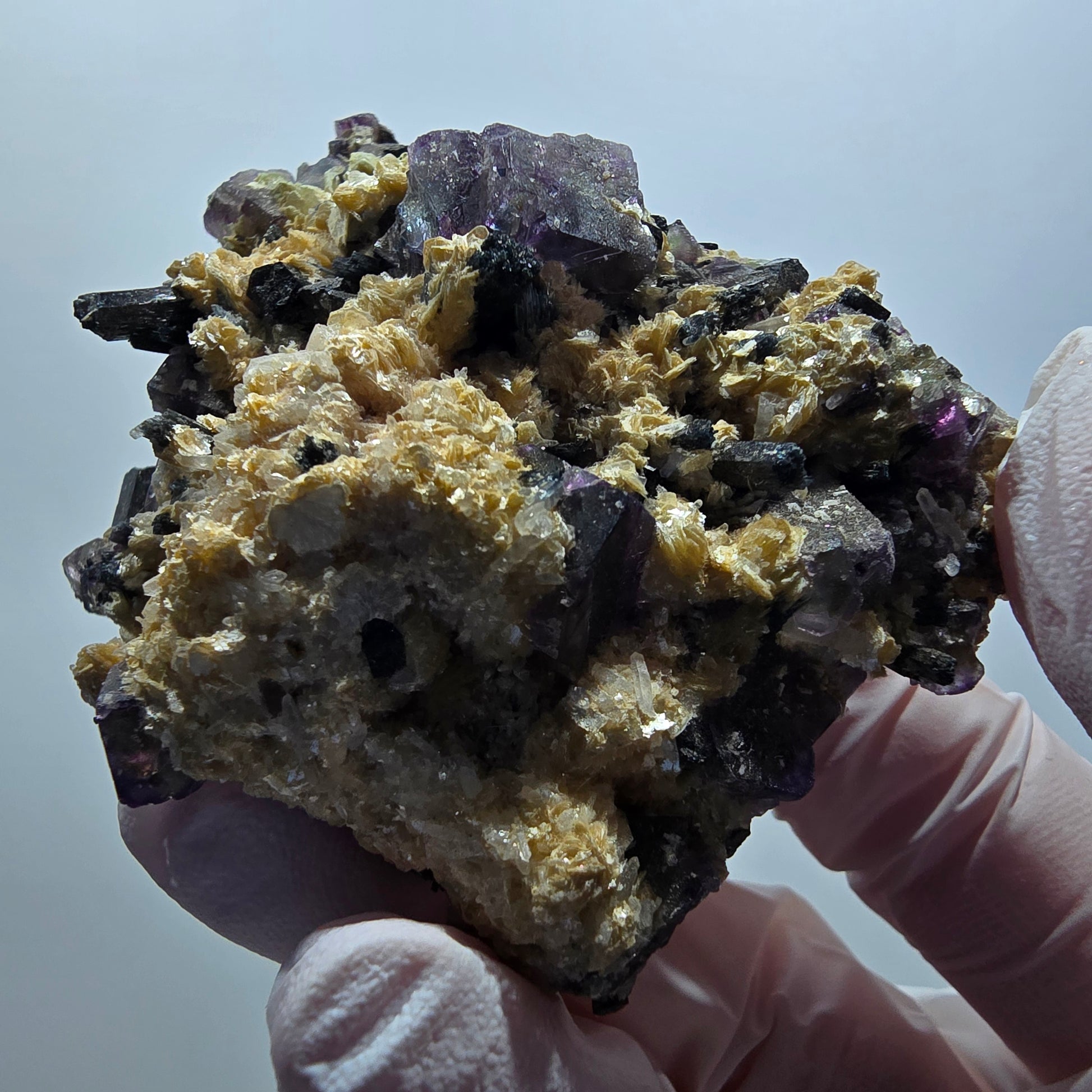 Die Besonderheit dieser Stufe: Zusätzlich zu den spektakulären Phantom-Fluorit-Kristallen schmücken gelb metallisch glänzende Muskovit-Kristalle und schwarze, elegant verlängerte Schörl-Turmalin-Kristalle die Matrix. Mit den Maßen 69 × 52 × 26 mm und einem Gewicht von 89 g handelt es sich um ein beeindruckendes Sammlerstück.