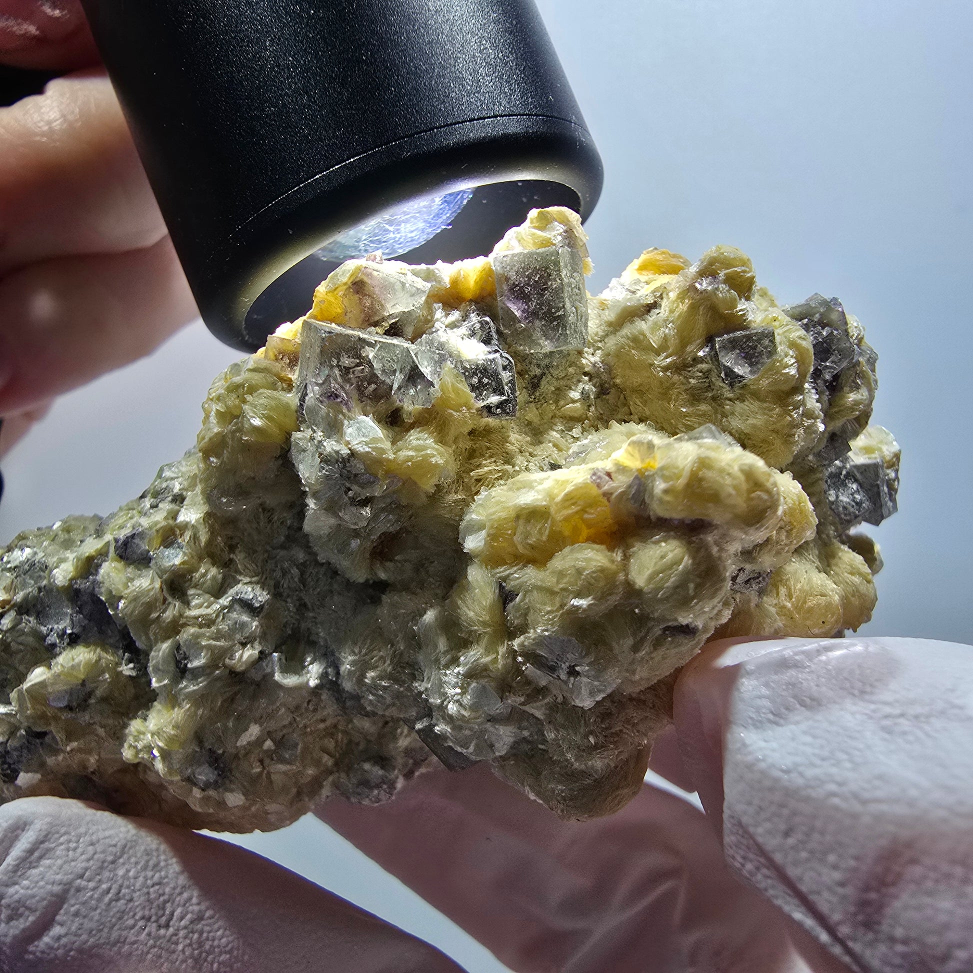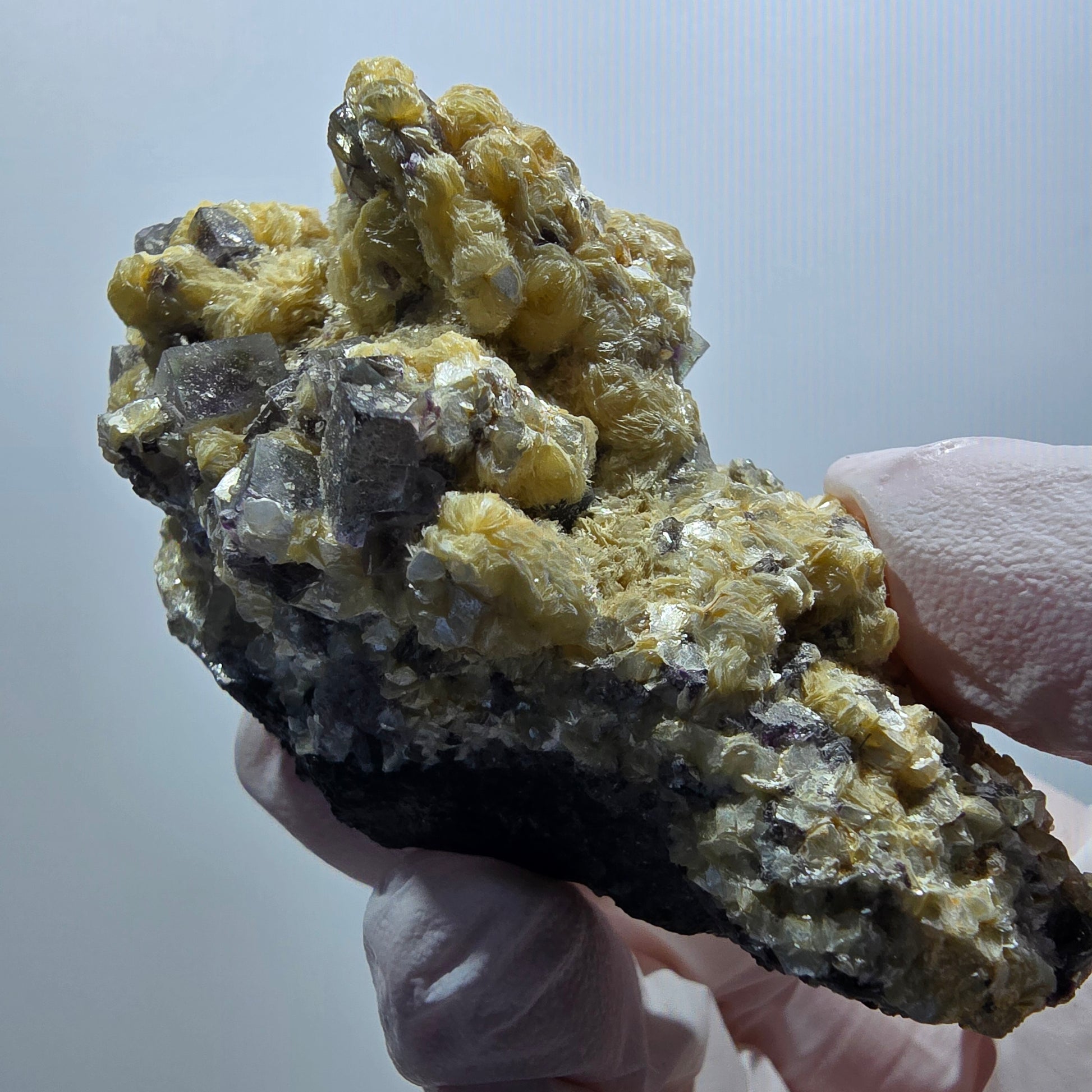 Entdecken Sie diese schöne Mineralienstufe mit bunten Phantom Fluorit-Würfeln in Grün, Lila, Braun, Gelb und Transparent, ergänzt durch gelb metallisch glänzende Muskovit-Kristalle und schwarze Schörl-Turmalin-Kristalle.